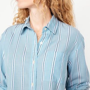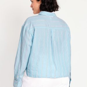 Cropped Button-Down Striped Shirt: spread collar, long sleeves with buttoned cuffs, full-button front, patch chest pocket, vertical striped print, #825106