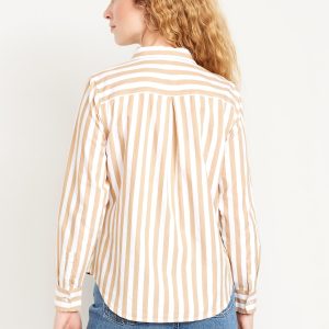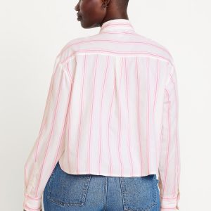 Cropped Button-Down Striped Shirt: spread collar, long sleeves with buttoned cuffs, full-button front, patch chest pocket, vertical striped print, #825106