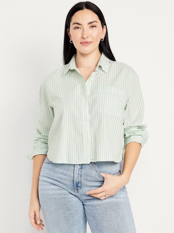 Cropped Button-Down Striped Shirt: spread collar, long sleeves with buttoned cuffs, full-button front, patch chest pocket, vertical striped print, #825106
