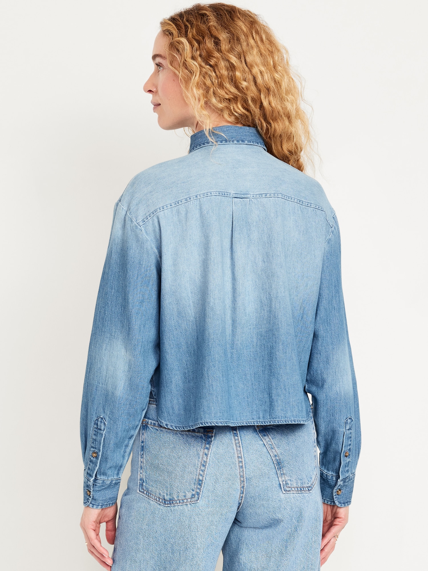Cropped Jean Button-Down Shirt: spread collar, long sleeves with buttoned cuffs, full-button front, patch chest pocket, vertical striped print, #825106