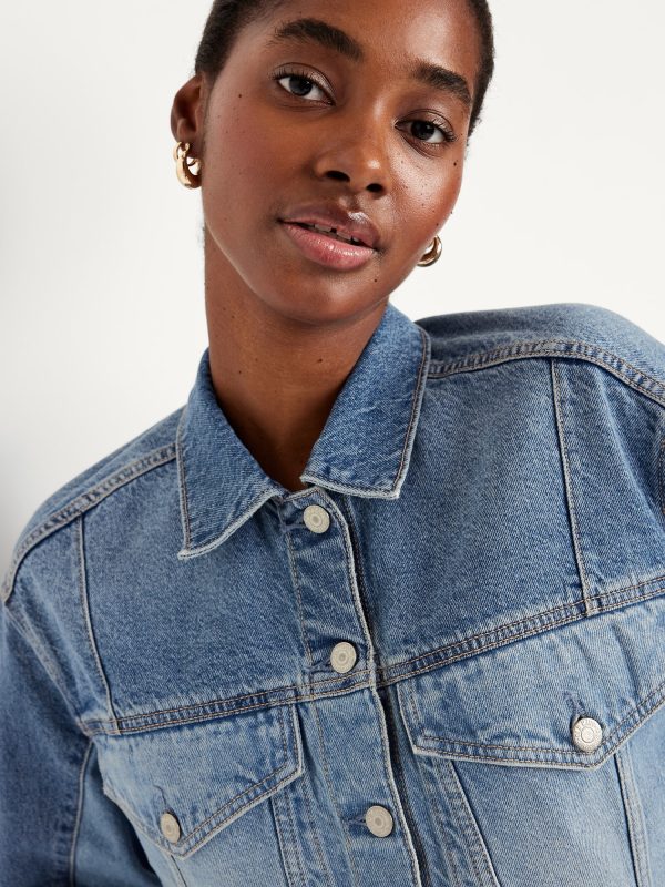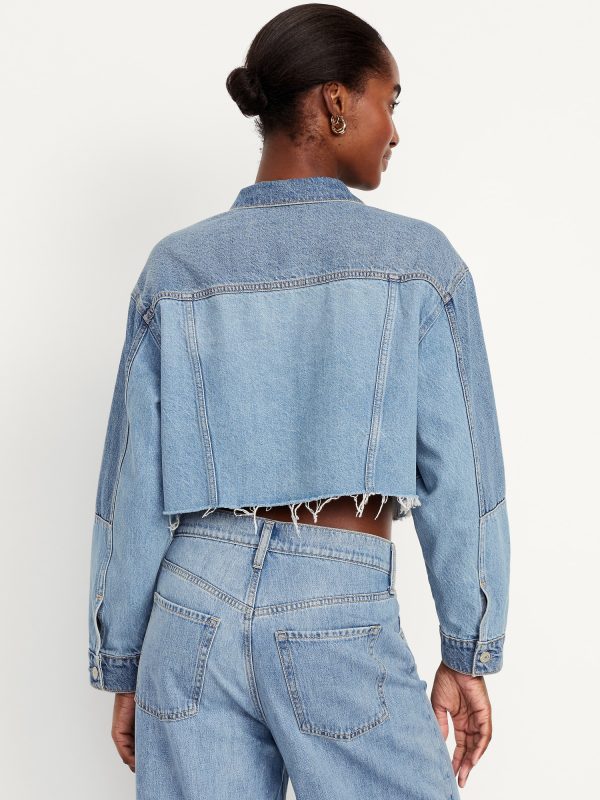 Cropped Jean Jacket: spread collar, long sleeves with buttoned cuffs, flap-button chest pockets, full-button front, cut-off hem, #766313