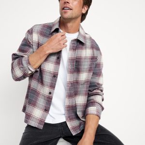 Cropped Plaid Flannel Shirt: spread collar, long sleeves with buttoned cuffs, full-button front, patch chest pocket, plaid print, #805557