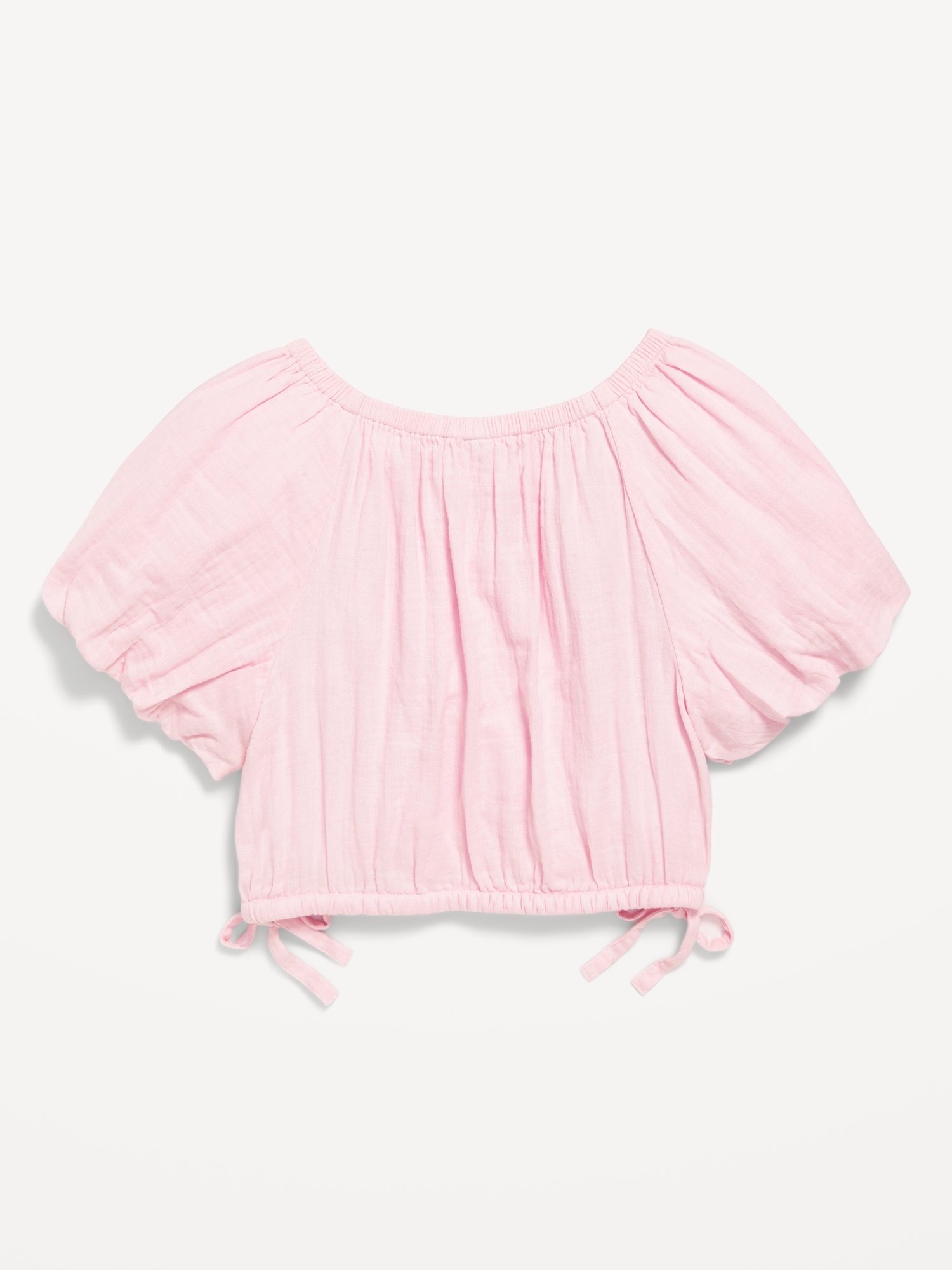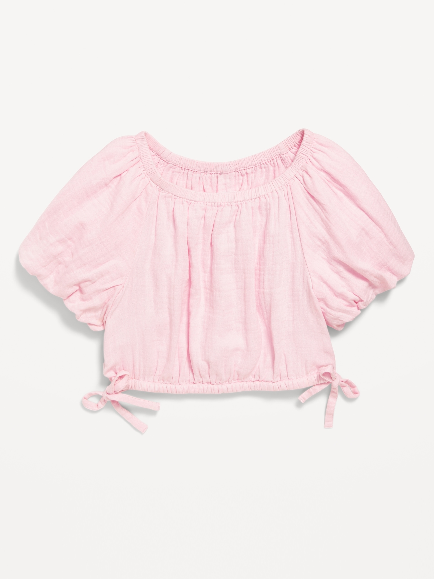 Cropped Short Puff-Sleeve Double-Weave Top for Girls: round elasticized neckline, short puff sleeves, elasticized hem, side tie-knots, #691037