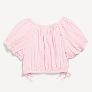 Cropped Short Puff-Sleeve Double-Weave Top for Girls