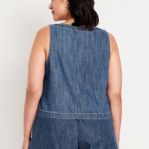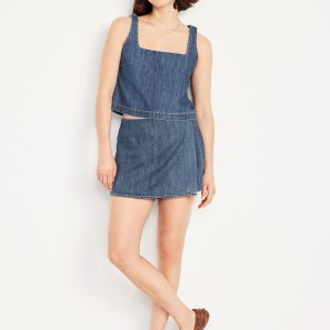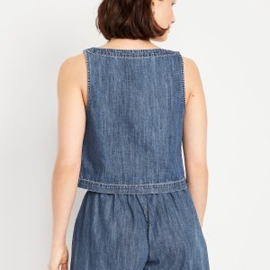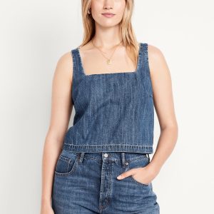 Cropped Square-Neck Denim Top: square neck, sleeveless, darted bust, #756733