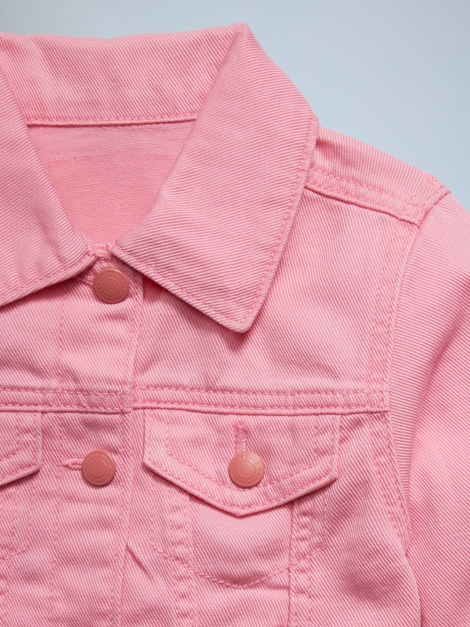 Cropped Trucker Twill Jacket for Toddler Girls: pointed collar, long sleeves, multi-color snap-button placket, faux snap-flap pockets at chest, on-seam welt pockets, #693444