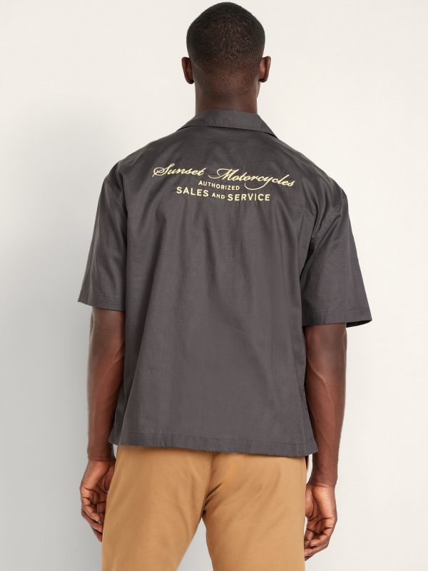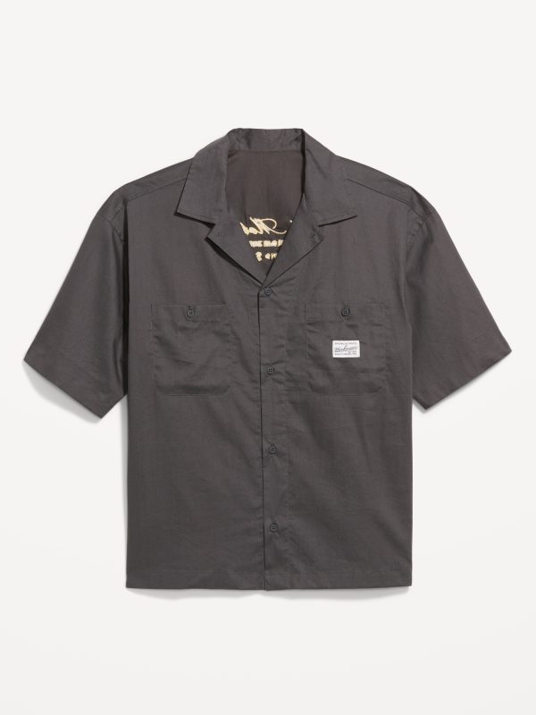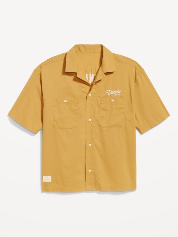Cropped Utility Pocket Shirt: notched collar, short sleeves, embroidered chest graphic varies, button-patch chest pockets, full-button front, #762369