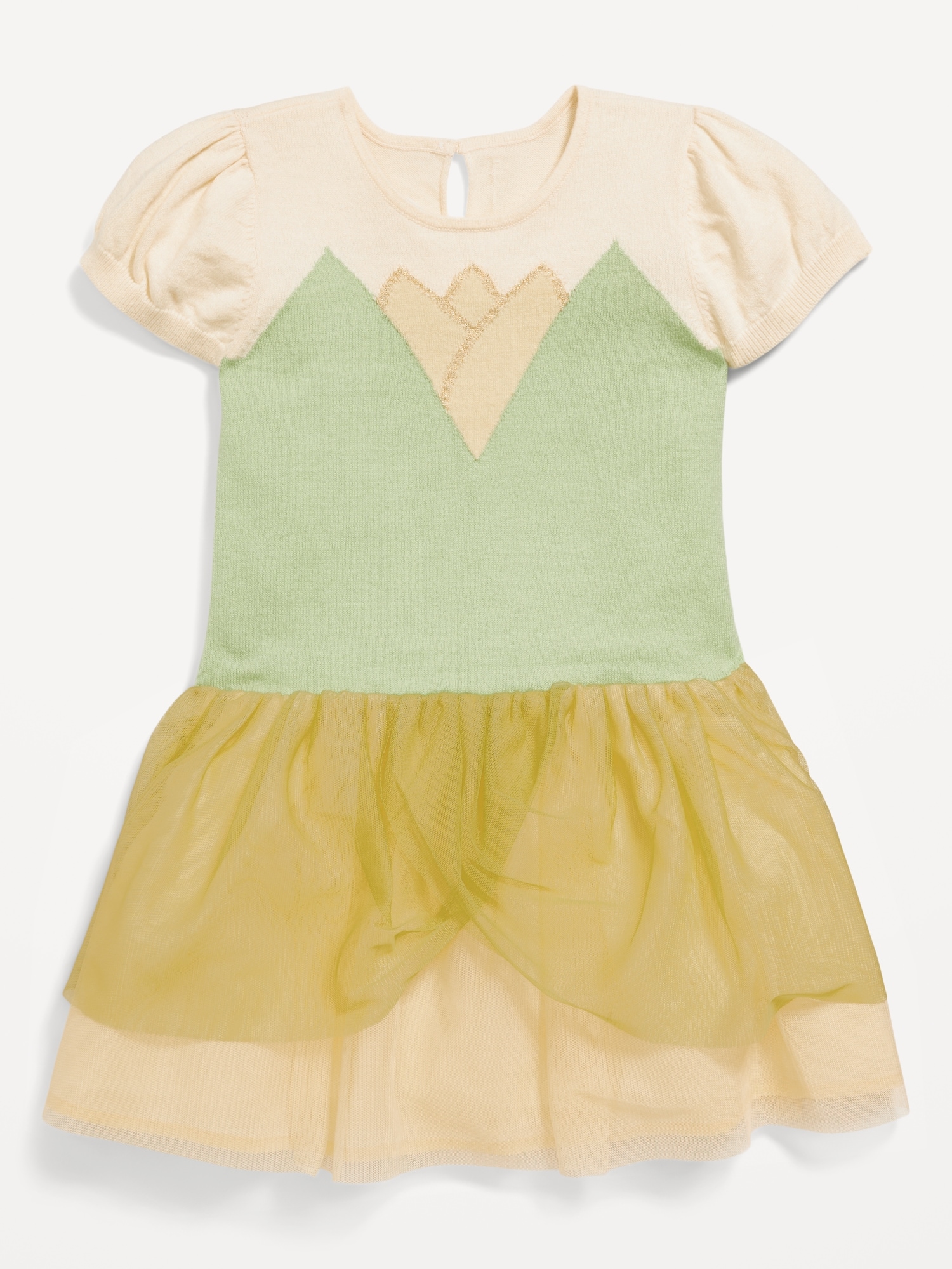 Disney© Short-Sleeve Tiana Tutu Dress: crew neck, cap sleeves, button-loop closure at nape, seamed waist with encased elastic, overlay at skirt, ©Disney, #766781