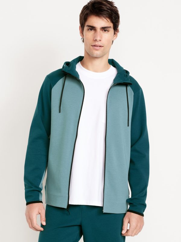 Dynamic Fleece 4.0 Color-Block Full Zip: Featuring Dynamic Fleece. Soft, smooth fleece plus made-to-move stretch.drawstring hood, long sleeves, full zipper, bonded pockets, hidden zip stash pocket at right, breathable, four-way stretch, #488688