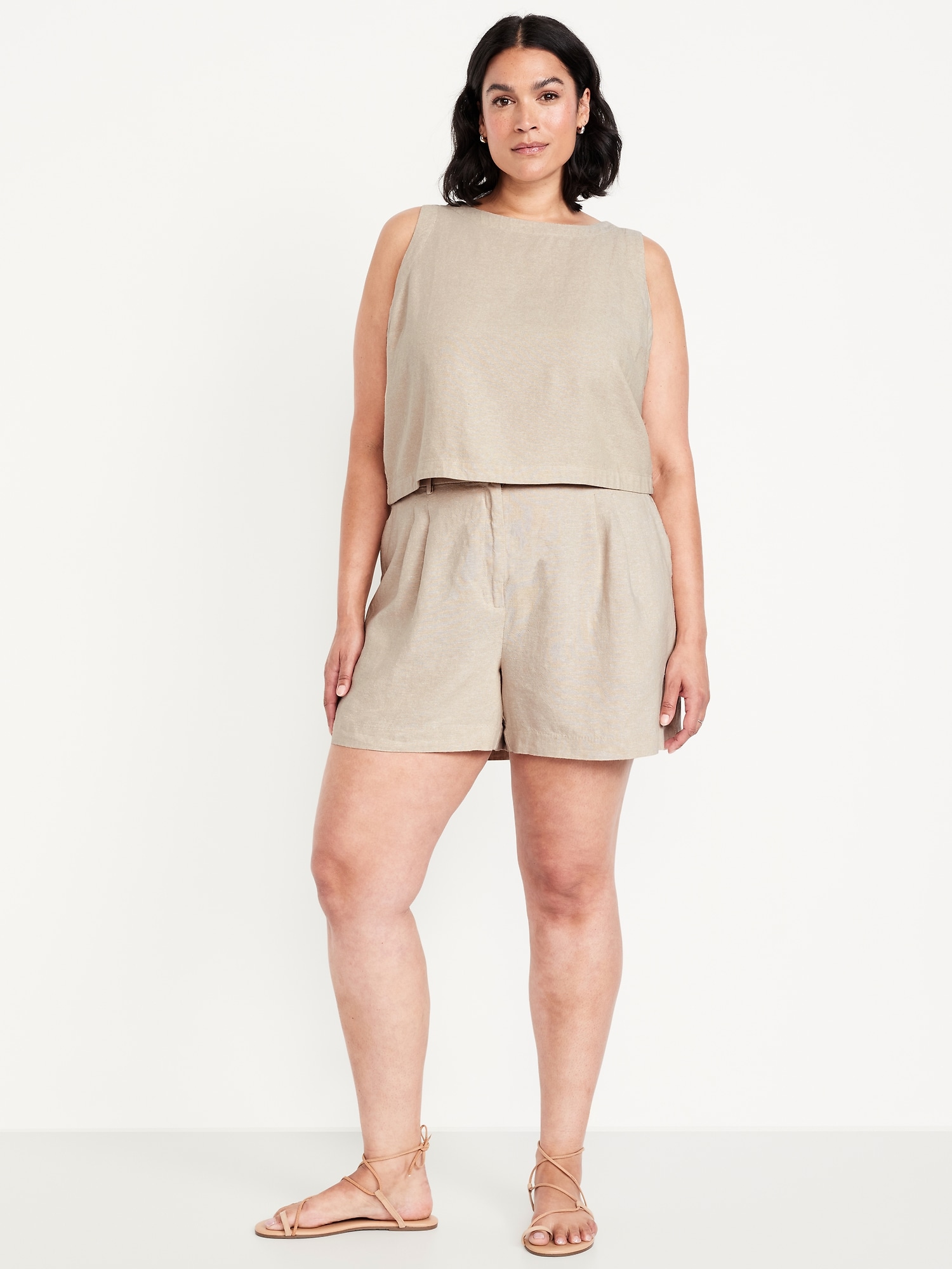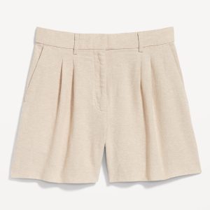 Extra High-Waisted Linen-Blend Taylor Trouser Shorts — 5-inch inseam: extra high adjustable waist, hook-and-bar closure, belt loops, hip pockets, functional back welt pocket, pleated front, #748111