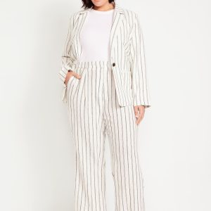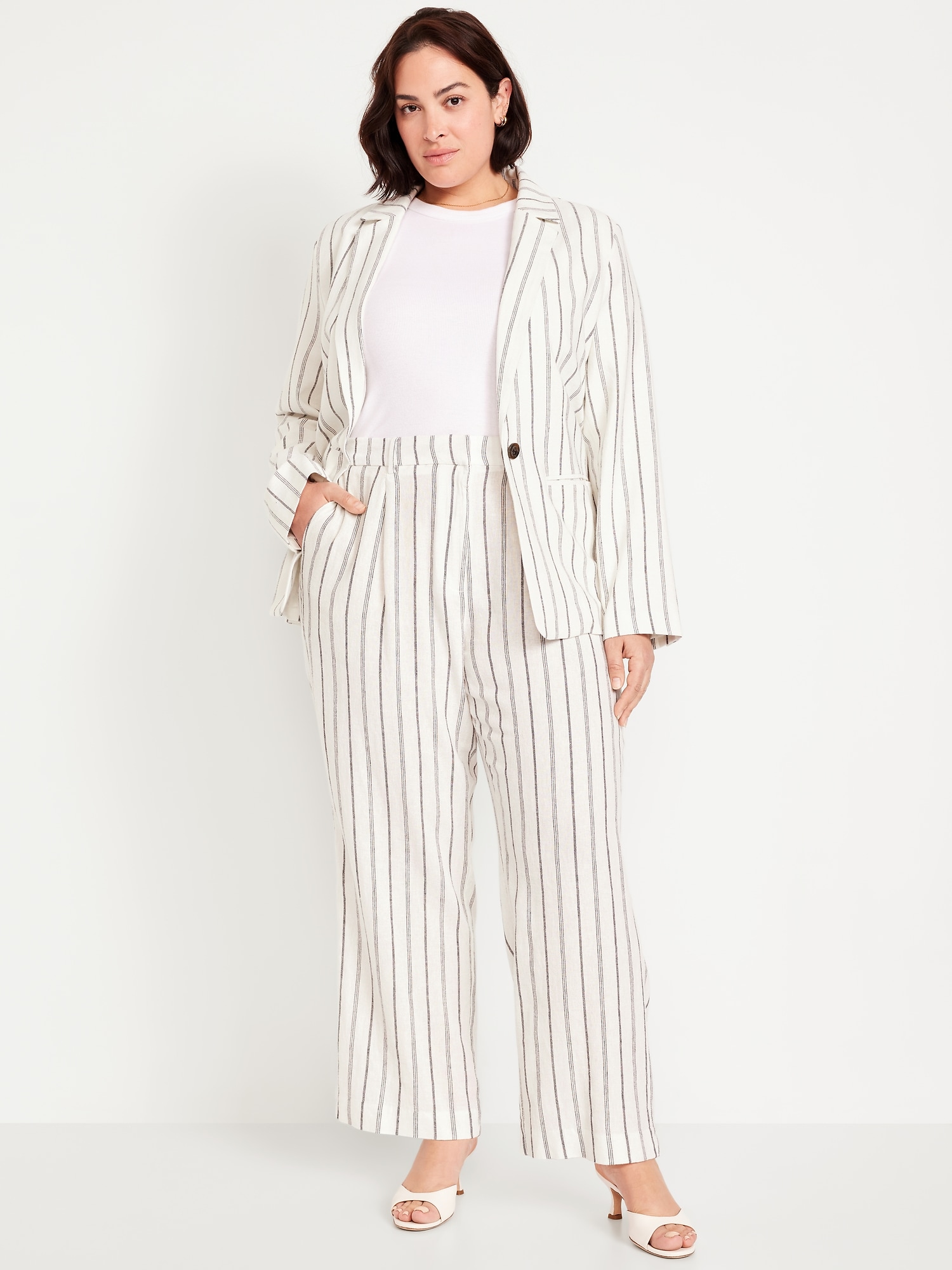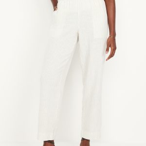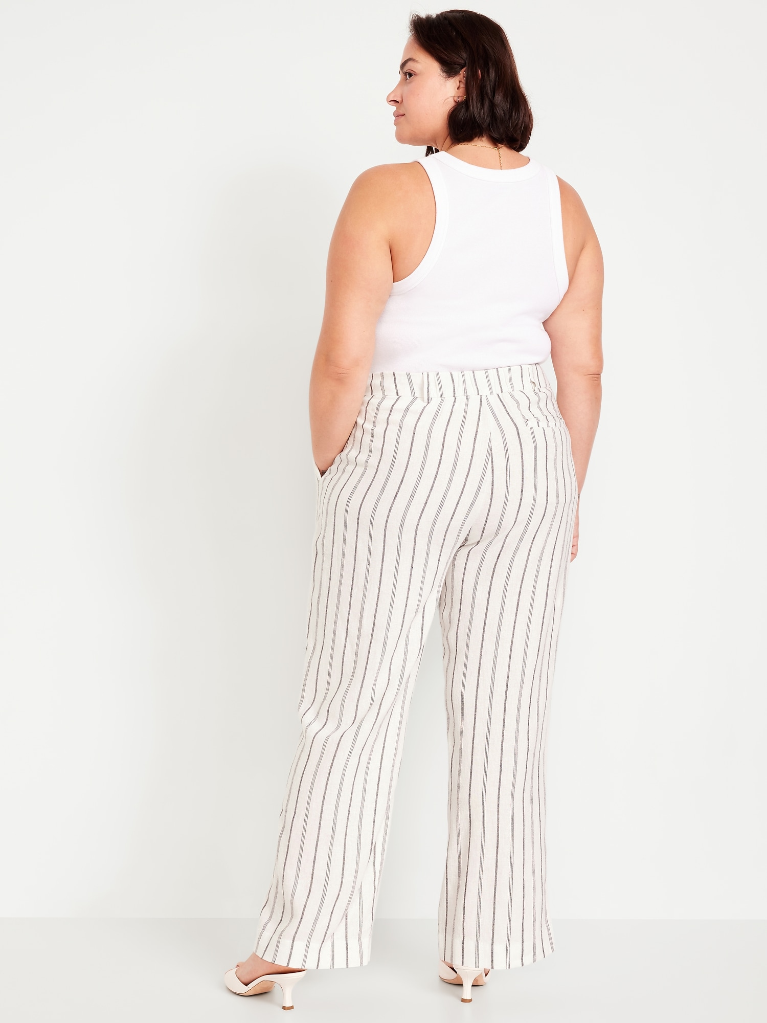 Extra High-Waisted Linen-Blend Taylor Wide-Leg Trouser Pants: Tailored pleats. Loose fit. Don’t do 9-5 (or 5-9) without them.partially-elasticized waistband, hook-and-bar closure, hip pockets, functional back welt pocket, striped print, wide leg, #683376