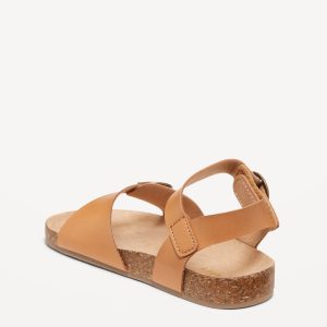 Faux-Leather Buckled Strap Sandals for Toddler Girls: buckled adhesive secure close ankle strap, double buckled straps across foot, faux-cork midsole, cushioned foot bed, #689190