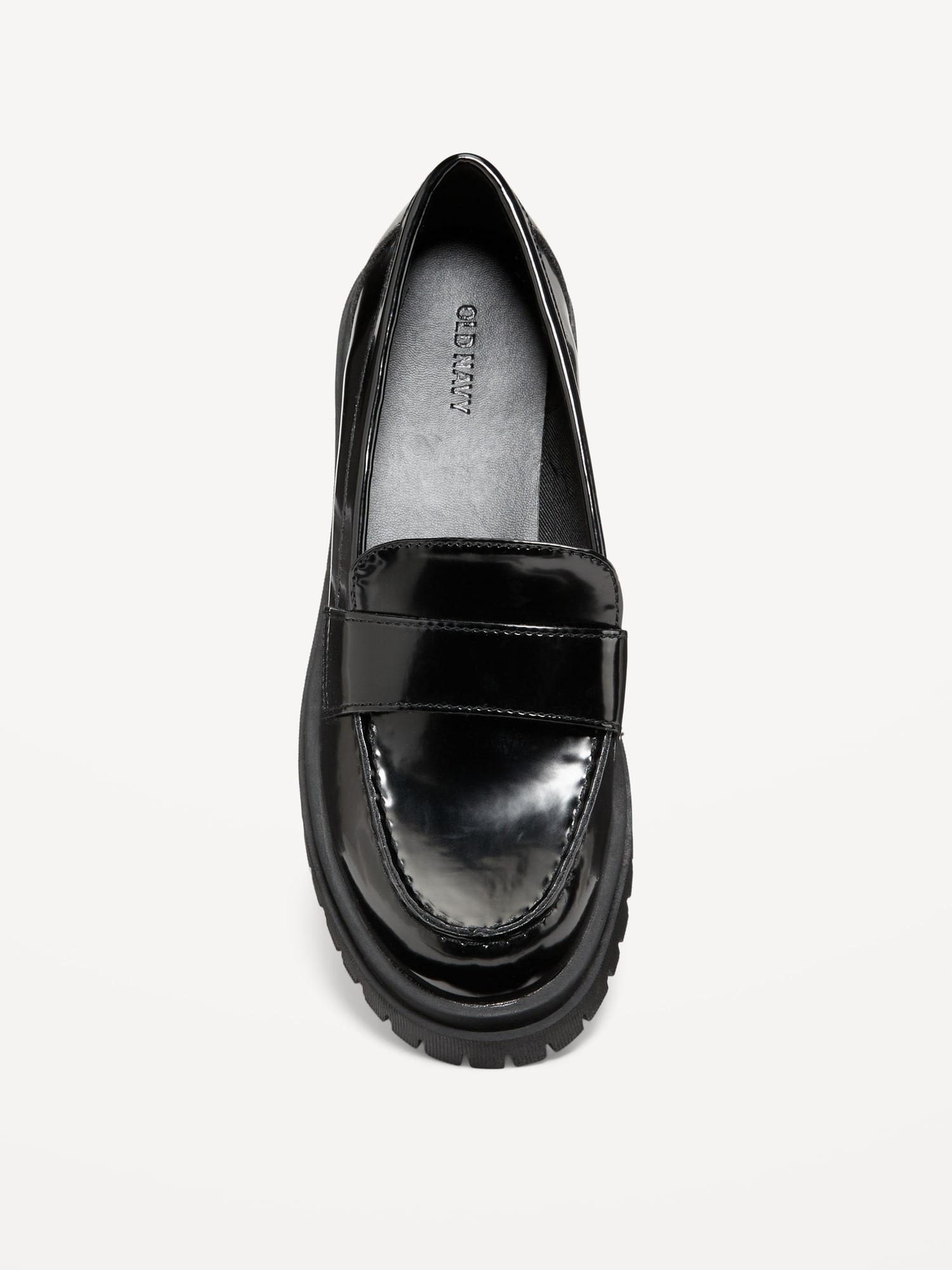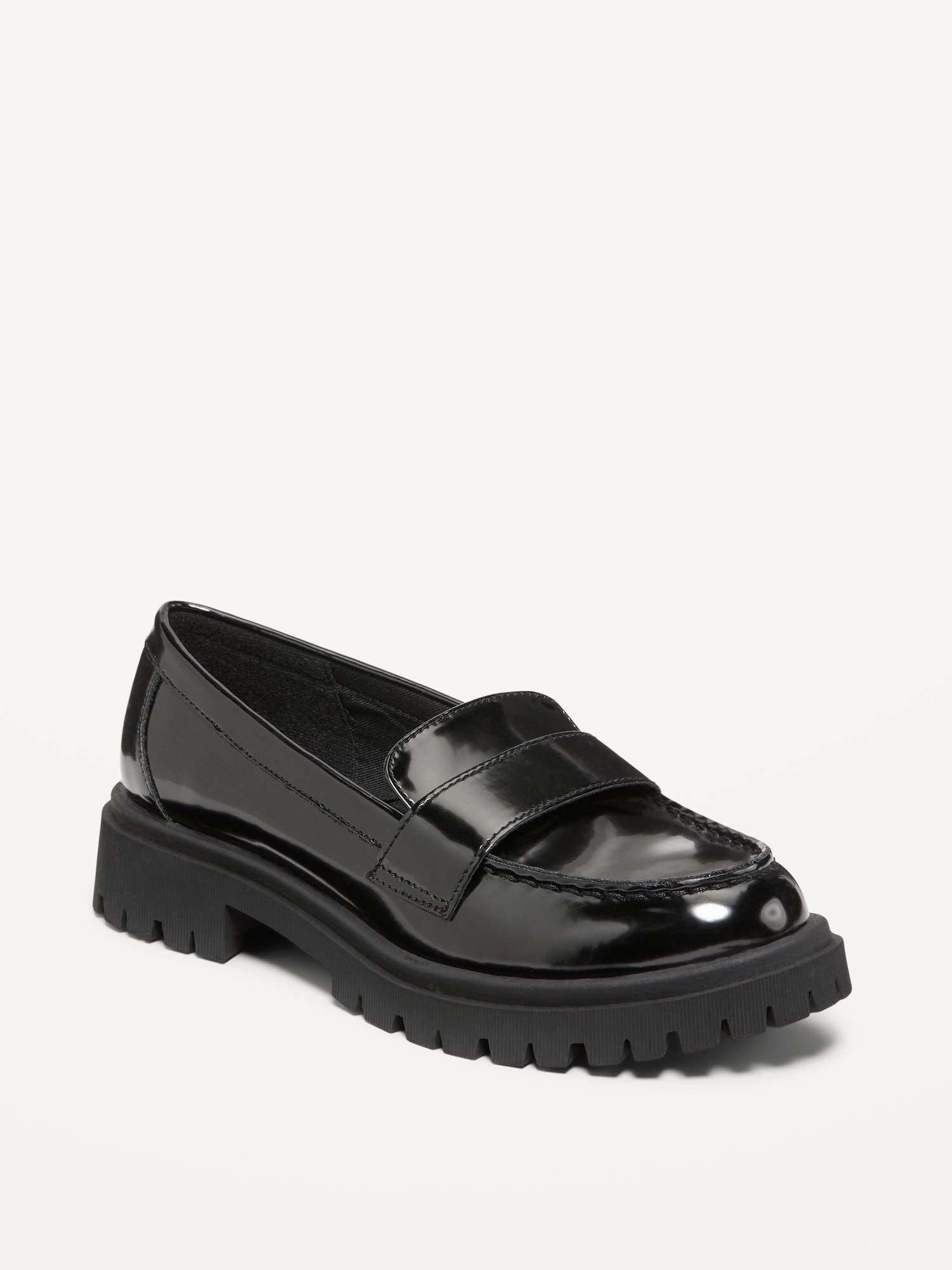 Faux-Leather Chunky Heel Loafers: textured faux-leather upper, loafer strap at vamp, cushioned foot bed, rugged lug sole, chunky heel, #544280
