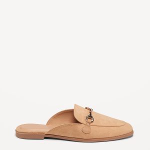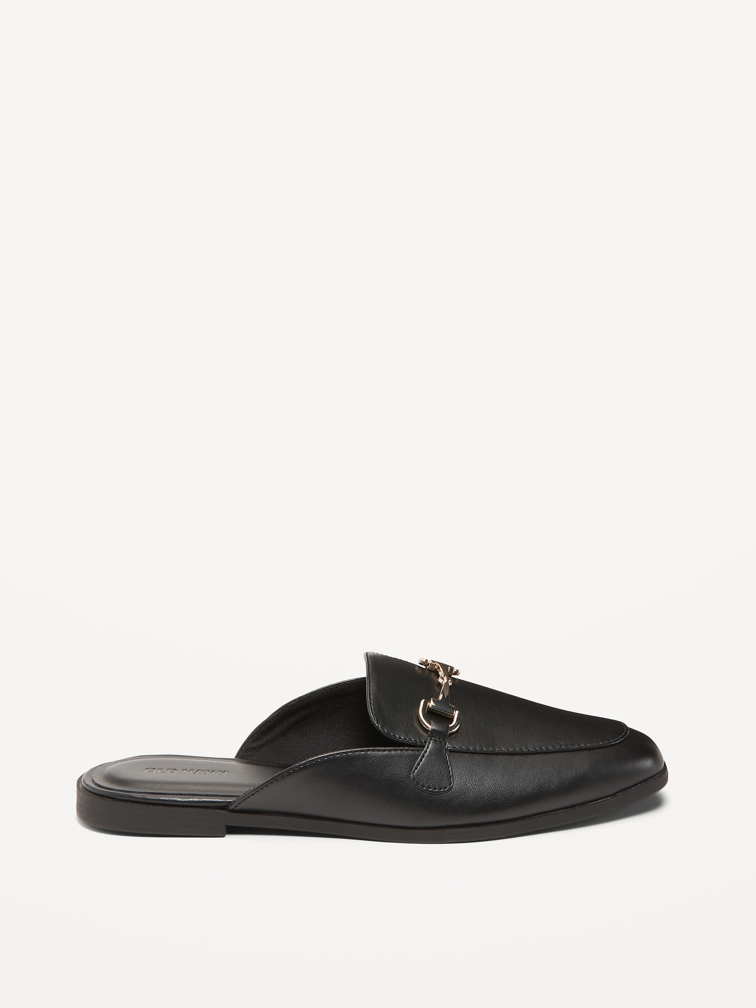 Faux-Leather Loafer Mule Shoes: Faux-leather upper, with buckle front detail, open mule heel, and pointed, square toe., Cushioned faux-leather foot bed., Textured thermoplastic rubber outsole., These shoes are made with a 51% recycled thermoplastic rubber outsole. Less waste in the world ??, #745325