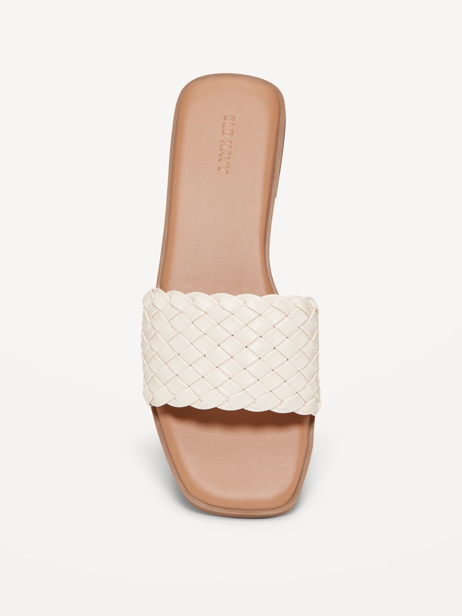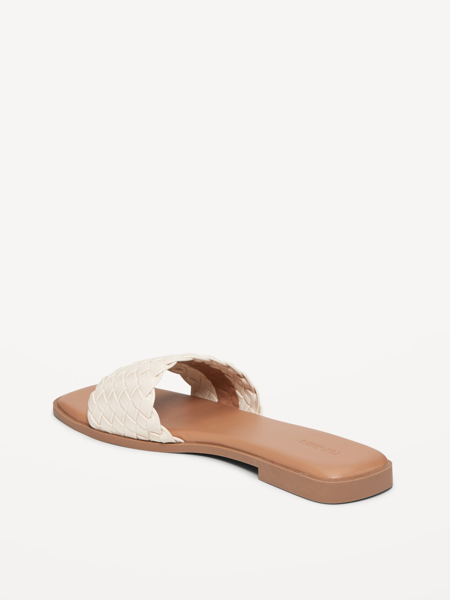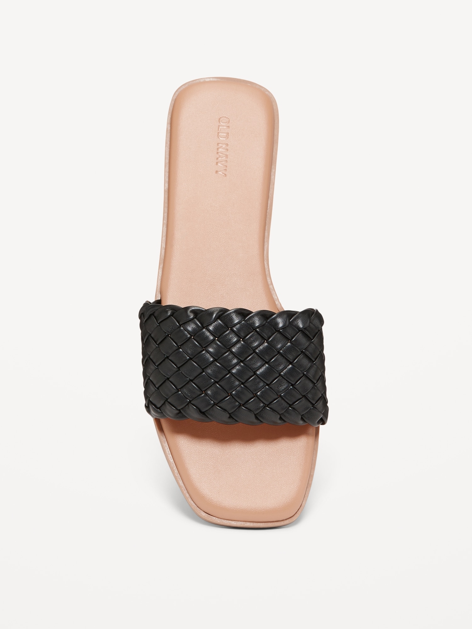 Faux-Leather Woven Slide Sandals: single strap upper, square toe, cushioned foot bed, slide-on style, #684808