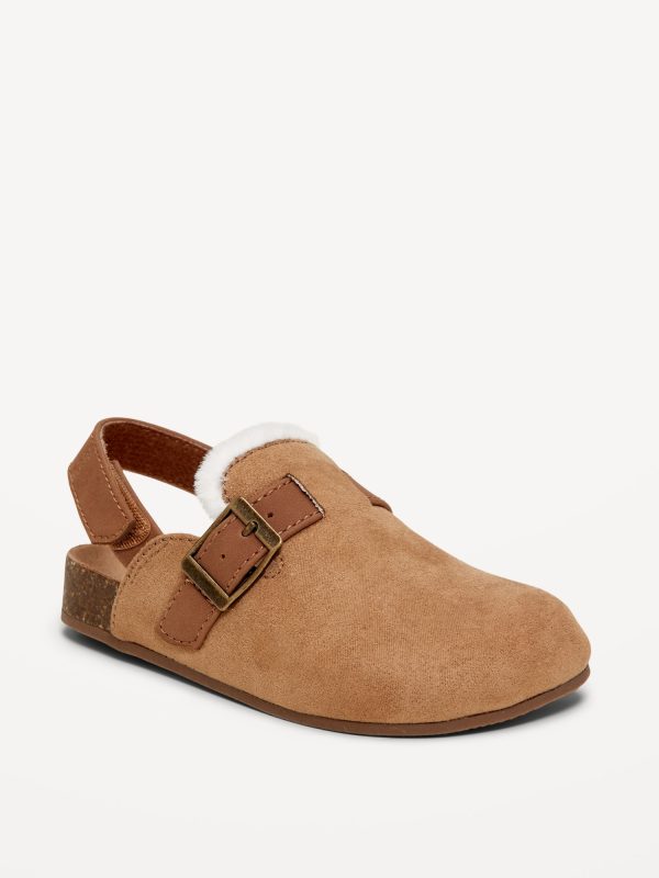 Faux-Suede Clogs for Toddler Girls: buckled strap across foot, adhesive secure close ankle strap, cork midsole and textured outsole, faux-fur trim, #800511