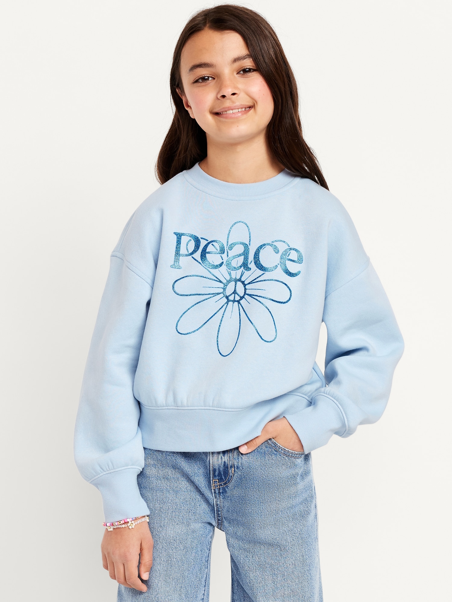 Favorite Fleece Oversized Graphic Sweatshirt for Girls: crew neck, long wide sleeves, drop shoulders, graphic at front, banded hem, #759550