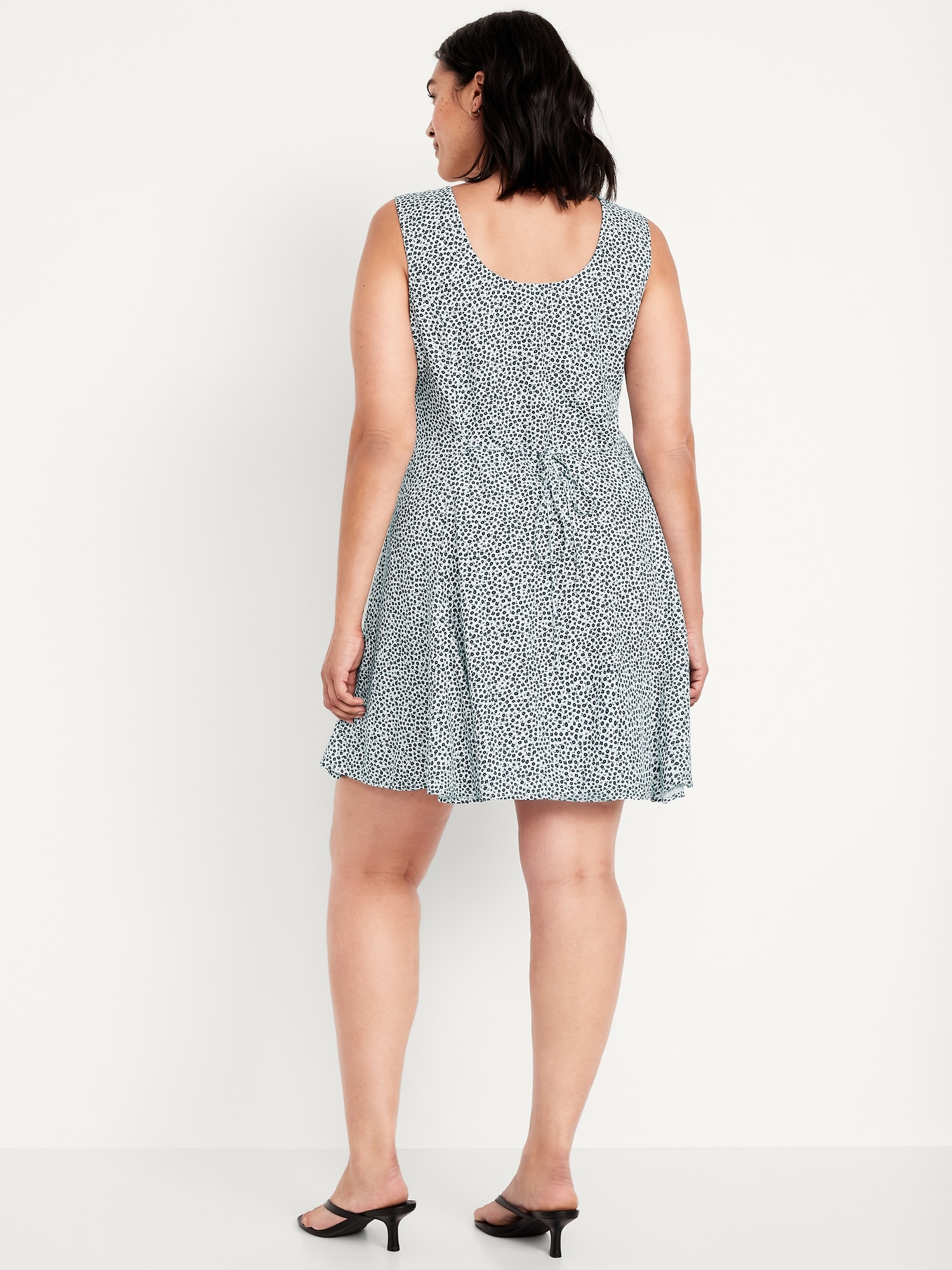 Fit & Flare Crepe Button-Front Mini Dress: scoop neck, wide straps, tie-back waist, full button front, princess seams, #798239