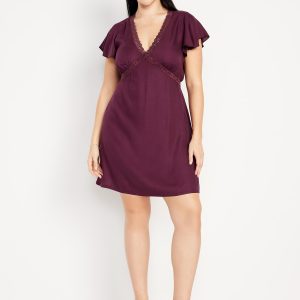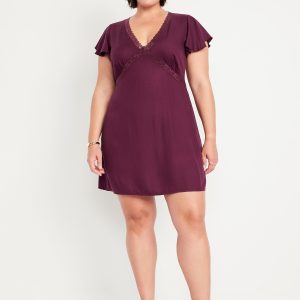 Fit & Flare Crepe Lace-Trim Mini Dress: lace-trim v-neck and bodice, short flutter sleeves, elasticized back waist, prints vary by color, #798245
