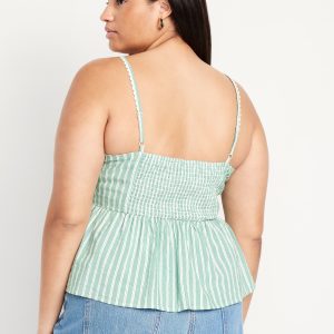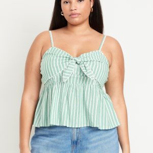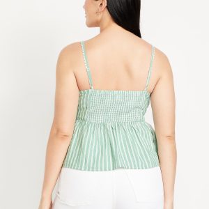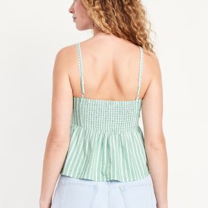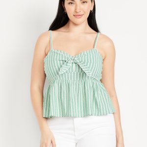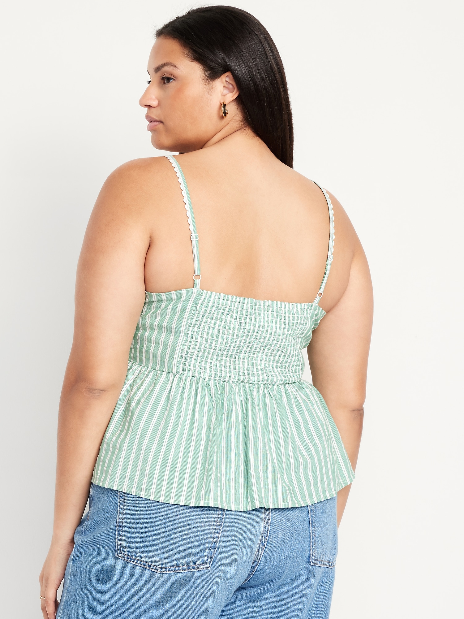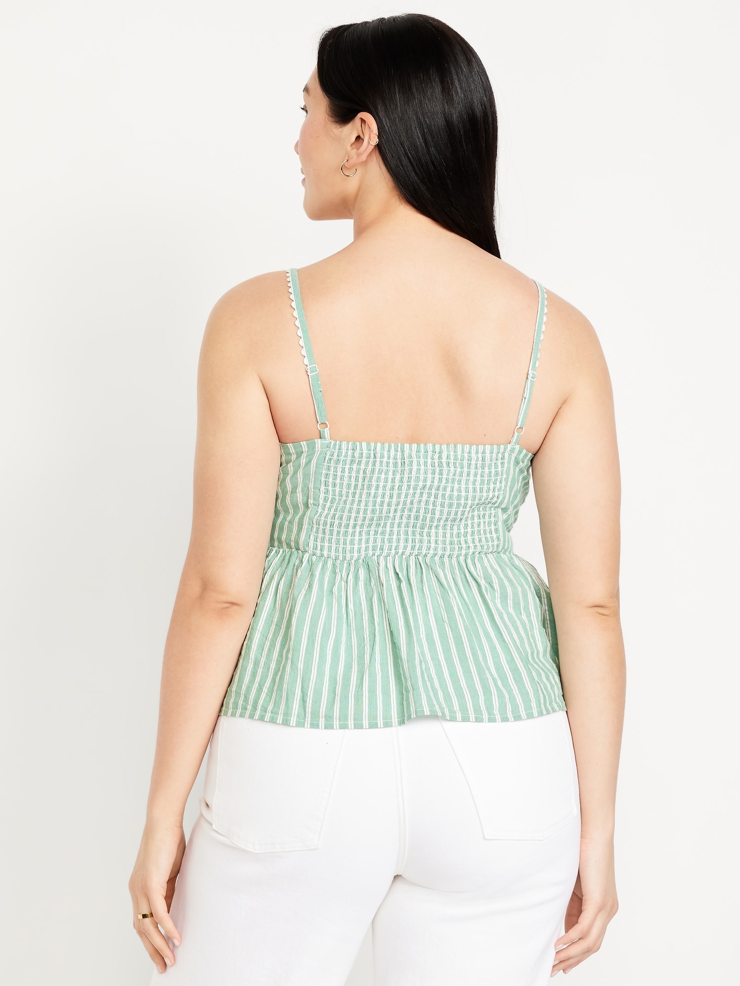 Fit & Flare Seersucker Peplum Top: knotted sweetheart neckline, adjustable straps, smocked back, peplum hem, floral and fruit print, #764190