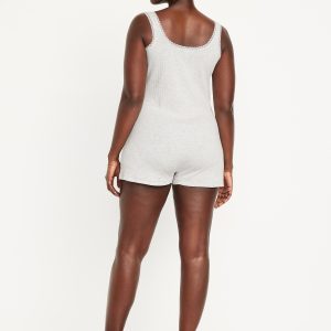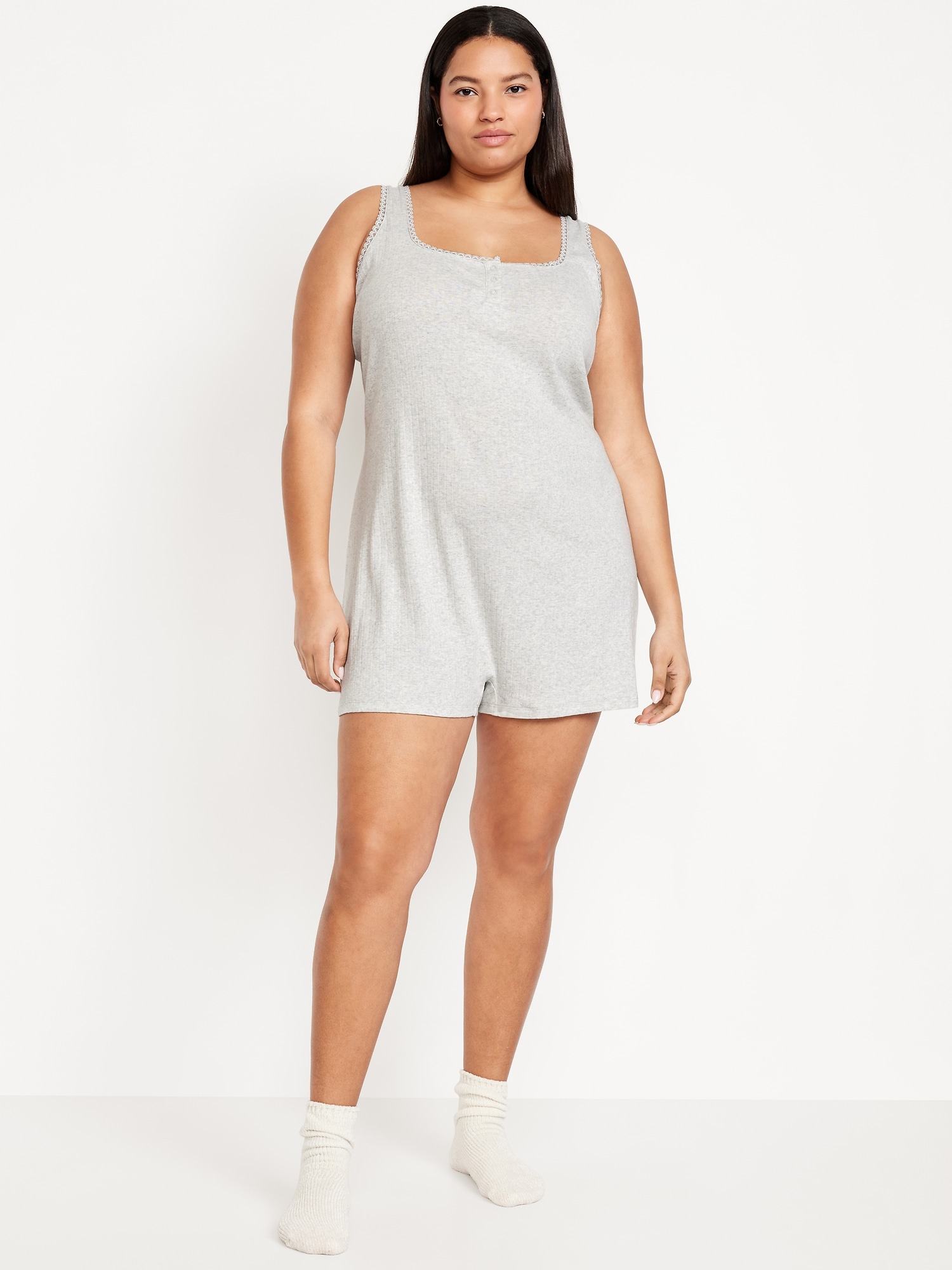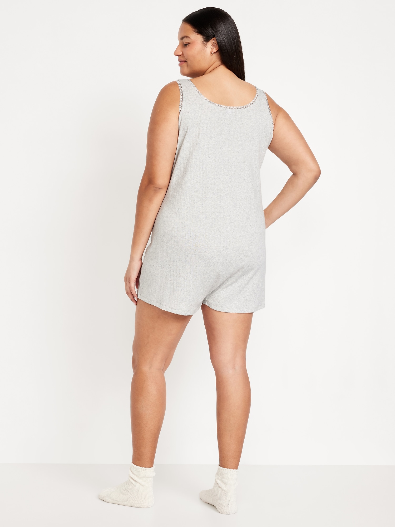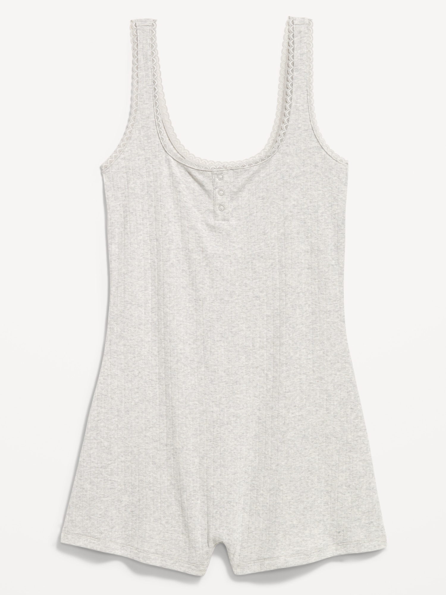 Fitted Pointelle Lace Pajama Romper: lace-trim square neck, wide straps, henley snap placket, #707444