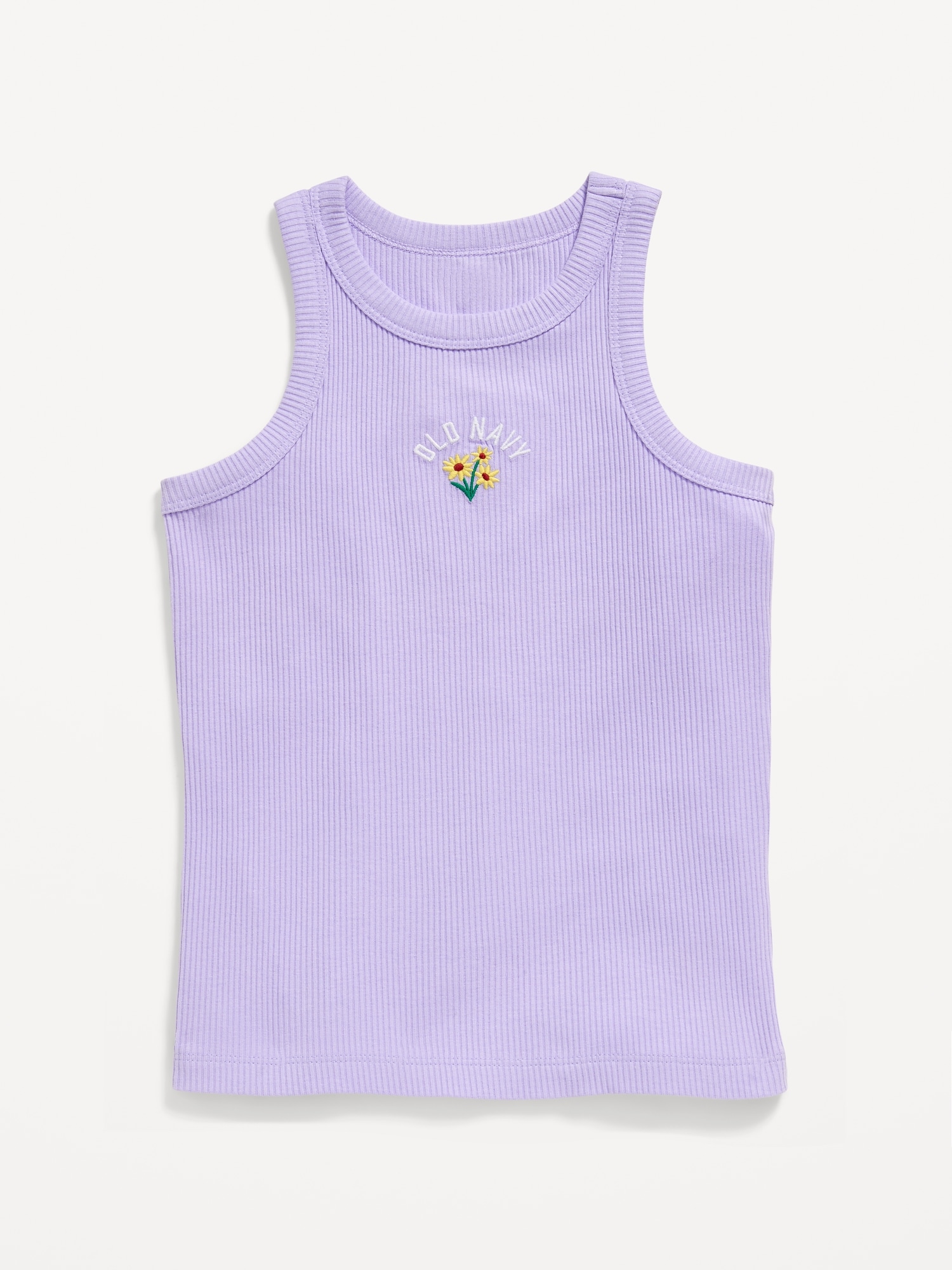 Fitted Ribbed Logo-Graphic Tank Top for Girls: high rounded neckline, sleeveless, logo graphic at front, available exclusively online and at old navy outlet stores., #663692