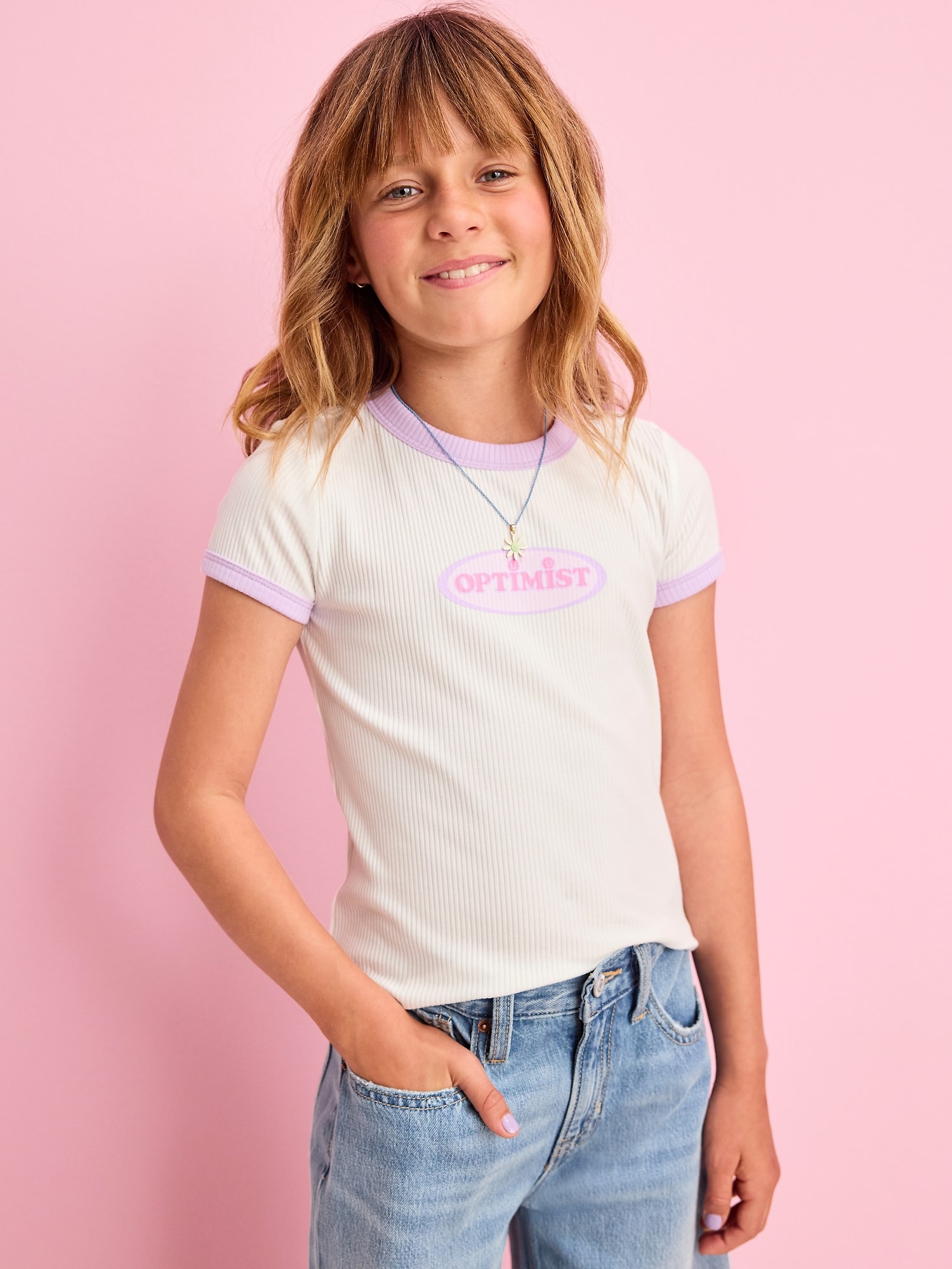 Fitted Short-Sleeve Ribbed Graphic Ringer T-Shirt for Girls: crew neck, short sleeves, graphic at front, #830946