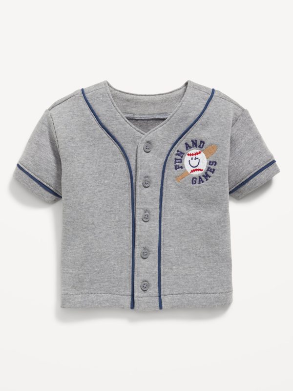 Fleece Baseball Shirt for Baby: v neck, short sleeves, graphic at chest, full length buttoned placket, contrasting pipe trim along cuffs and center, online exclusive, #762233