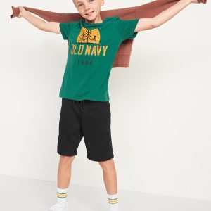 Fleece Jogger Shorts for Boys (At Knee): elasticized waistband, interior drawstring, on-seam welt pockets, faux fly, graphic or all-over pattern, easy pull-on style, #856544