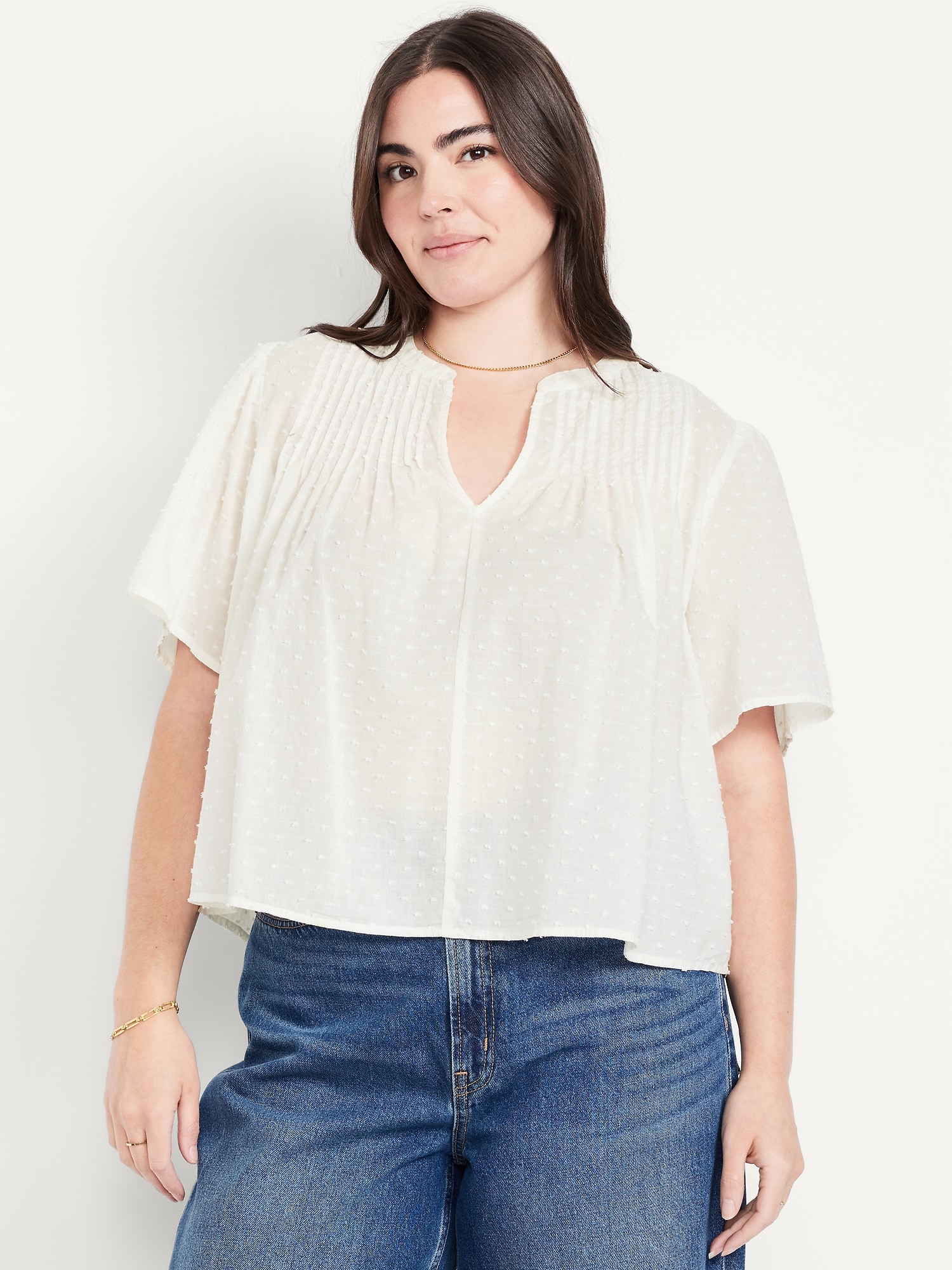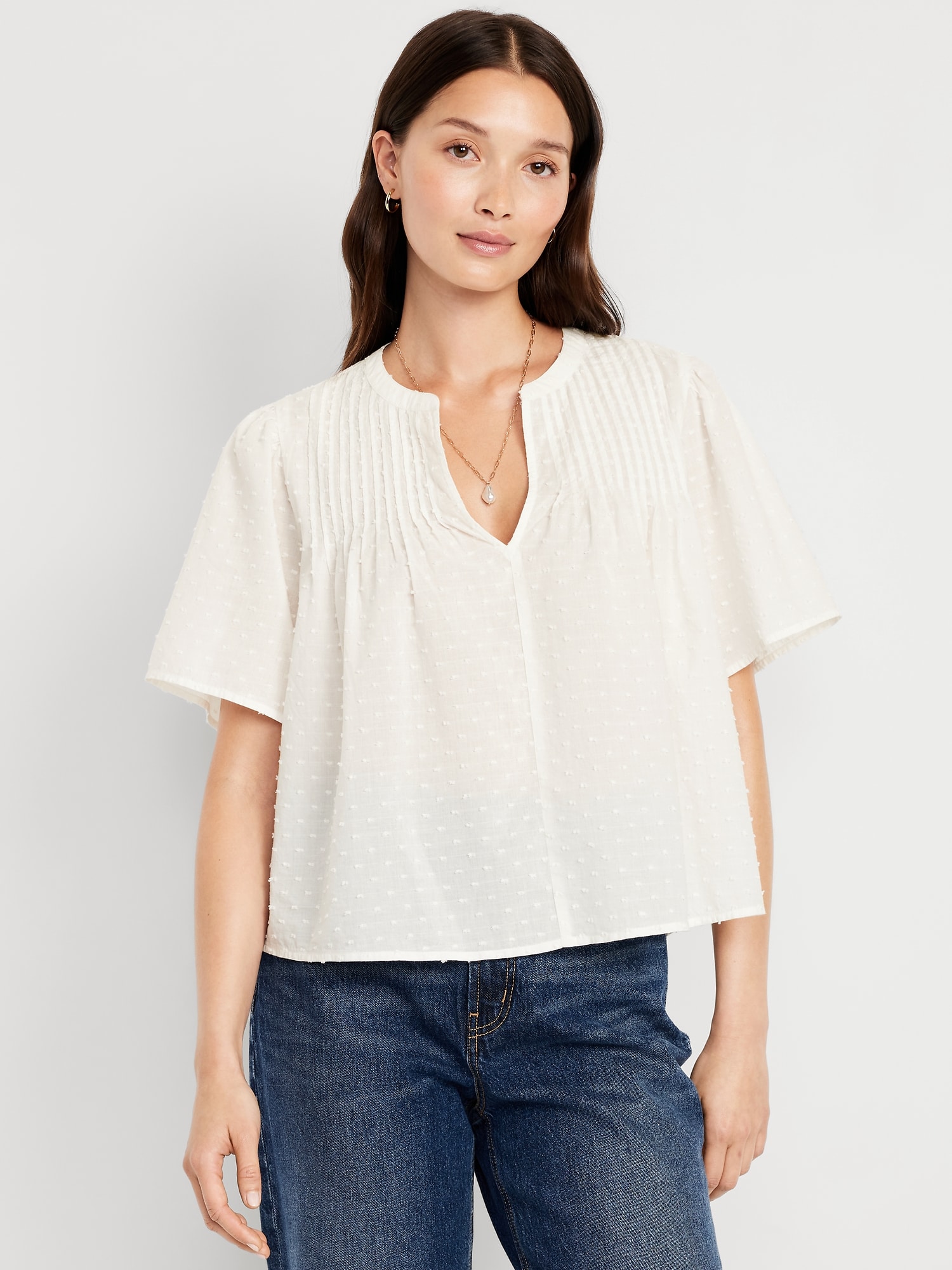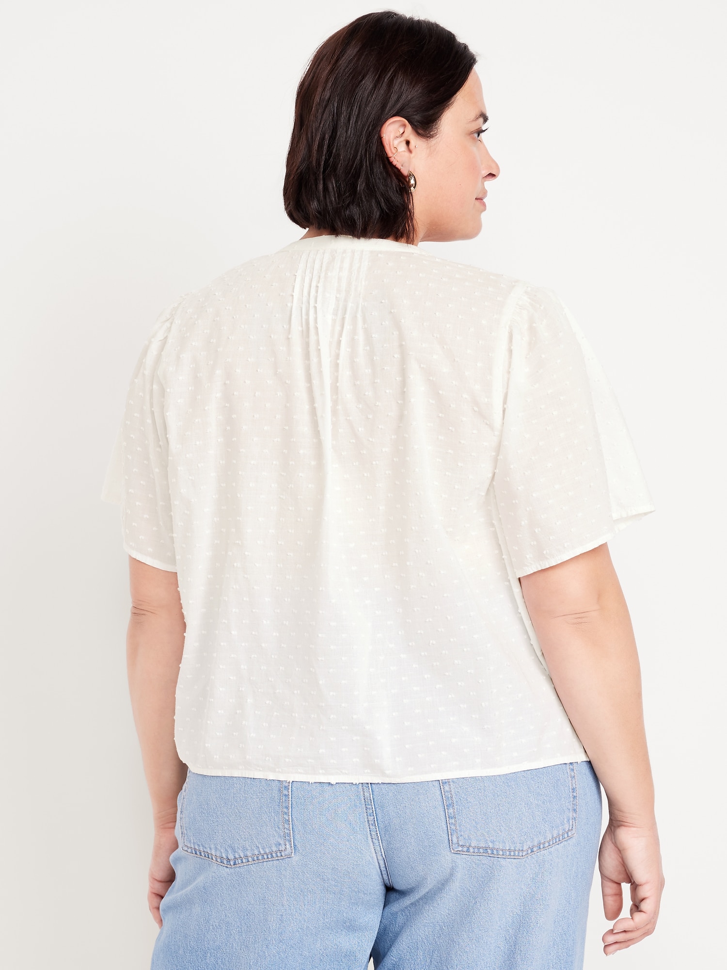 Flutter-Sleeve Swiss Dot Top: split v-neck, short flutter sleeves, pintuck pleats, #805730