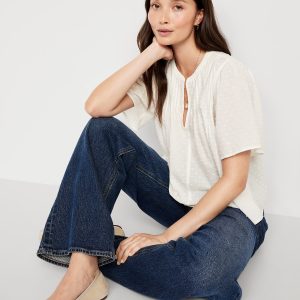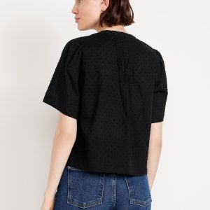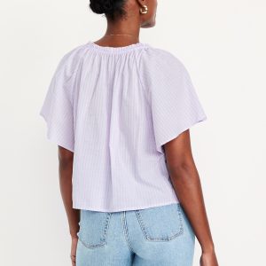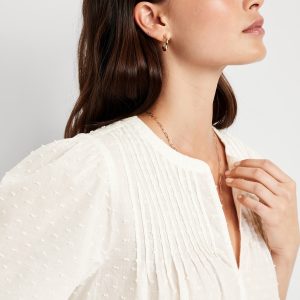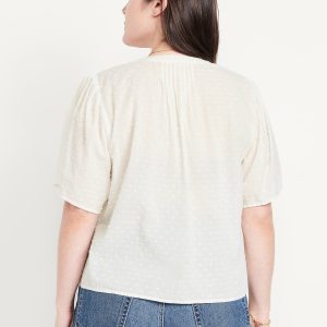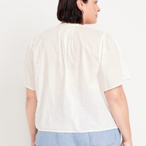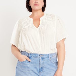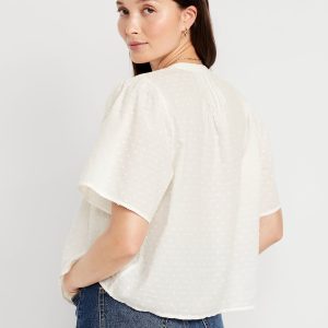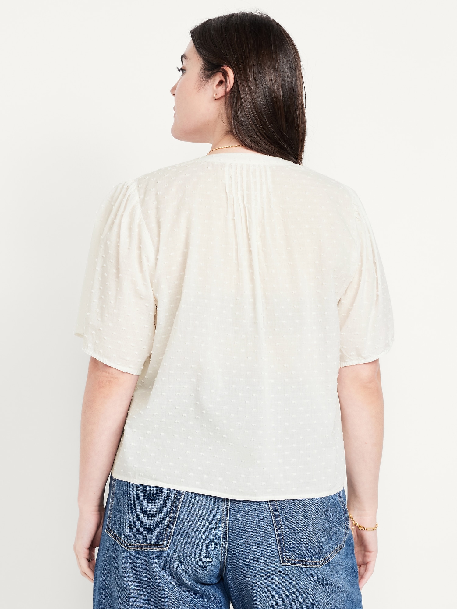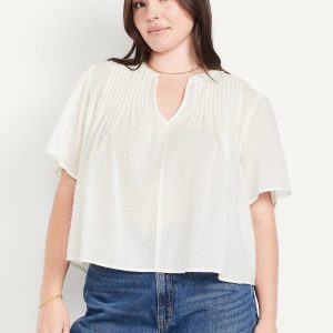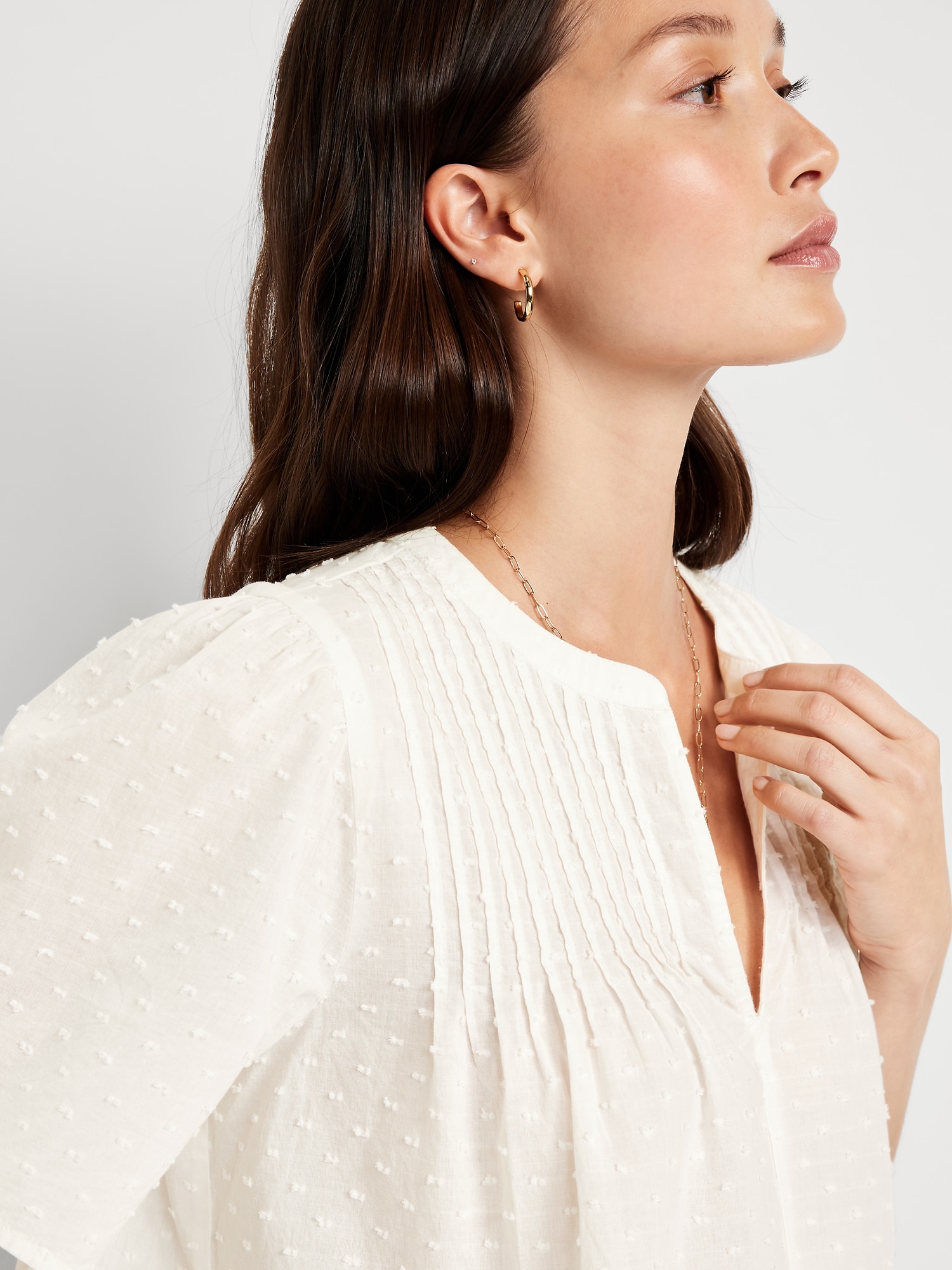 Flutter-Sleeve Swiss Dot Top: split v-neck, short flutter sleeves, pintuck pleats, #805730