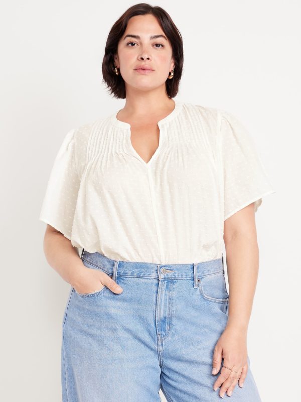 Flutter-Sleeve Swiss Dot Top: split v-neck, short flutter sleeves, pintuck pleats, #805730
