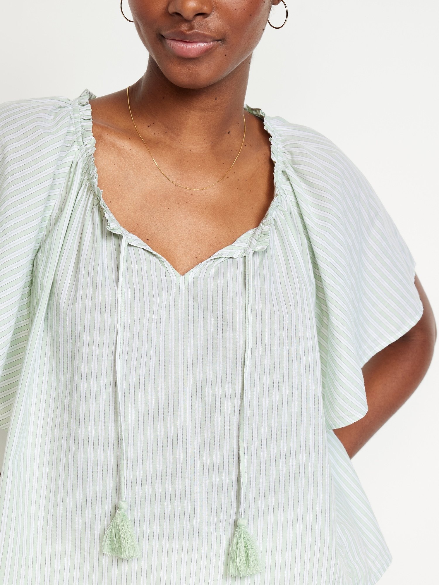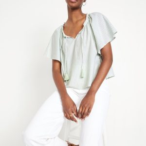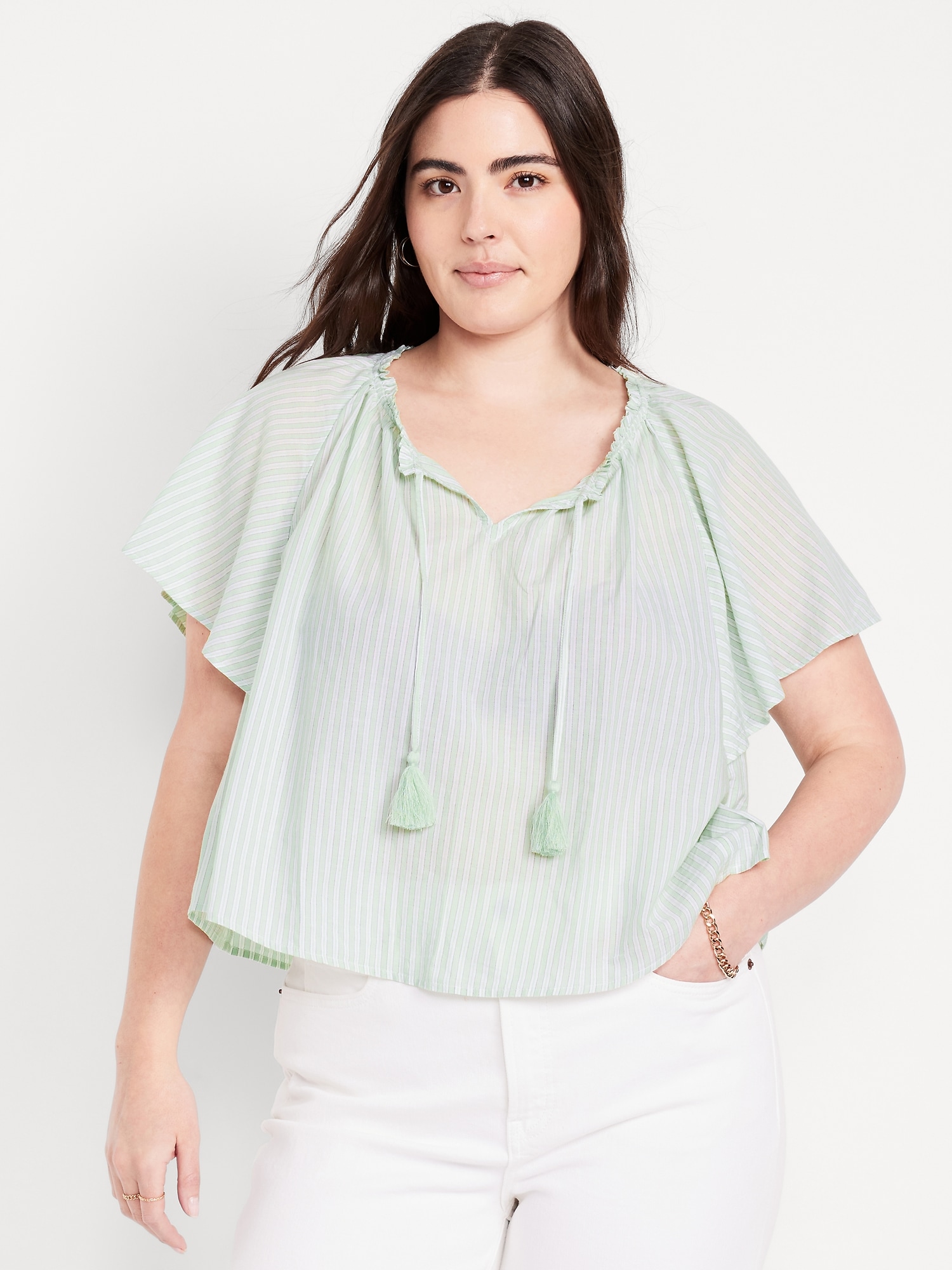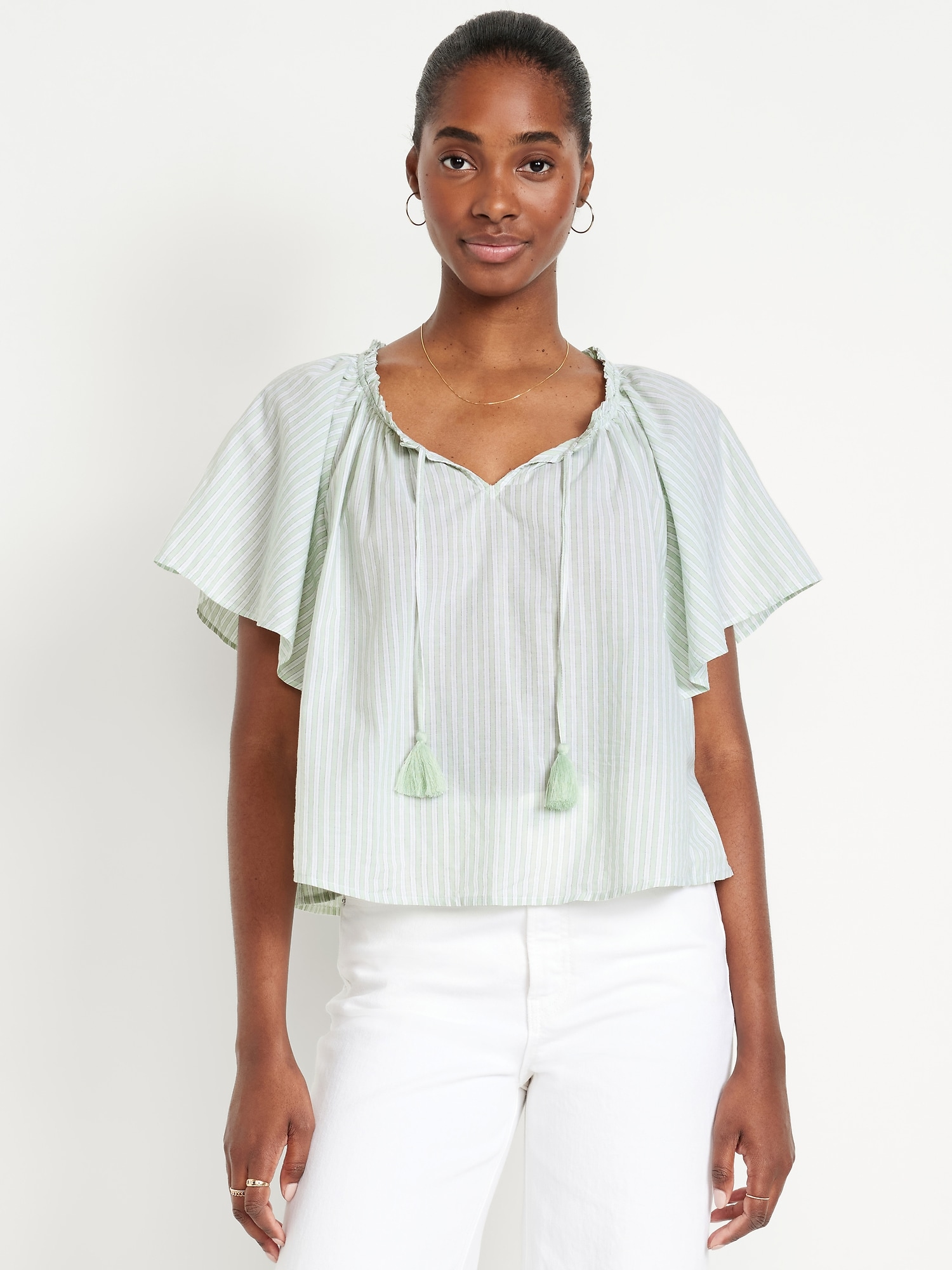 Flutter-Sleeve Tassel-Tie Top: v-neck tassel-tie front, short flutter sleeves, shirred detail, #764192