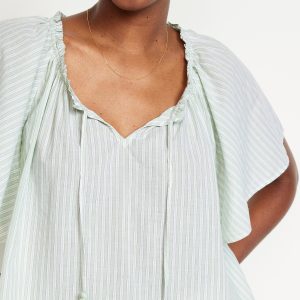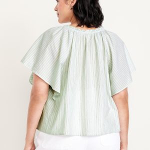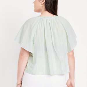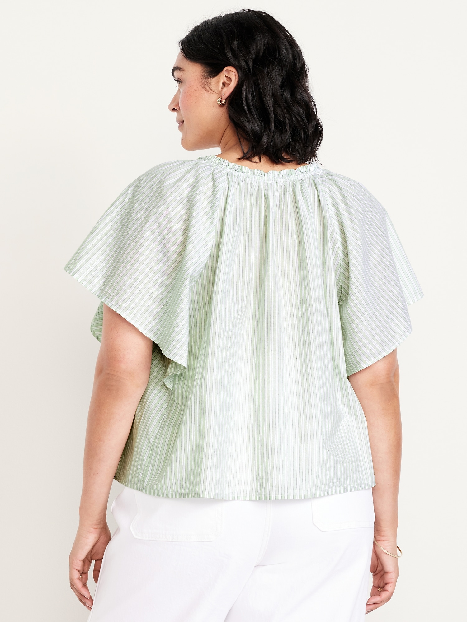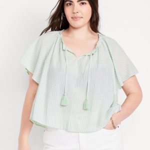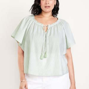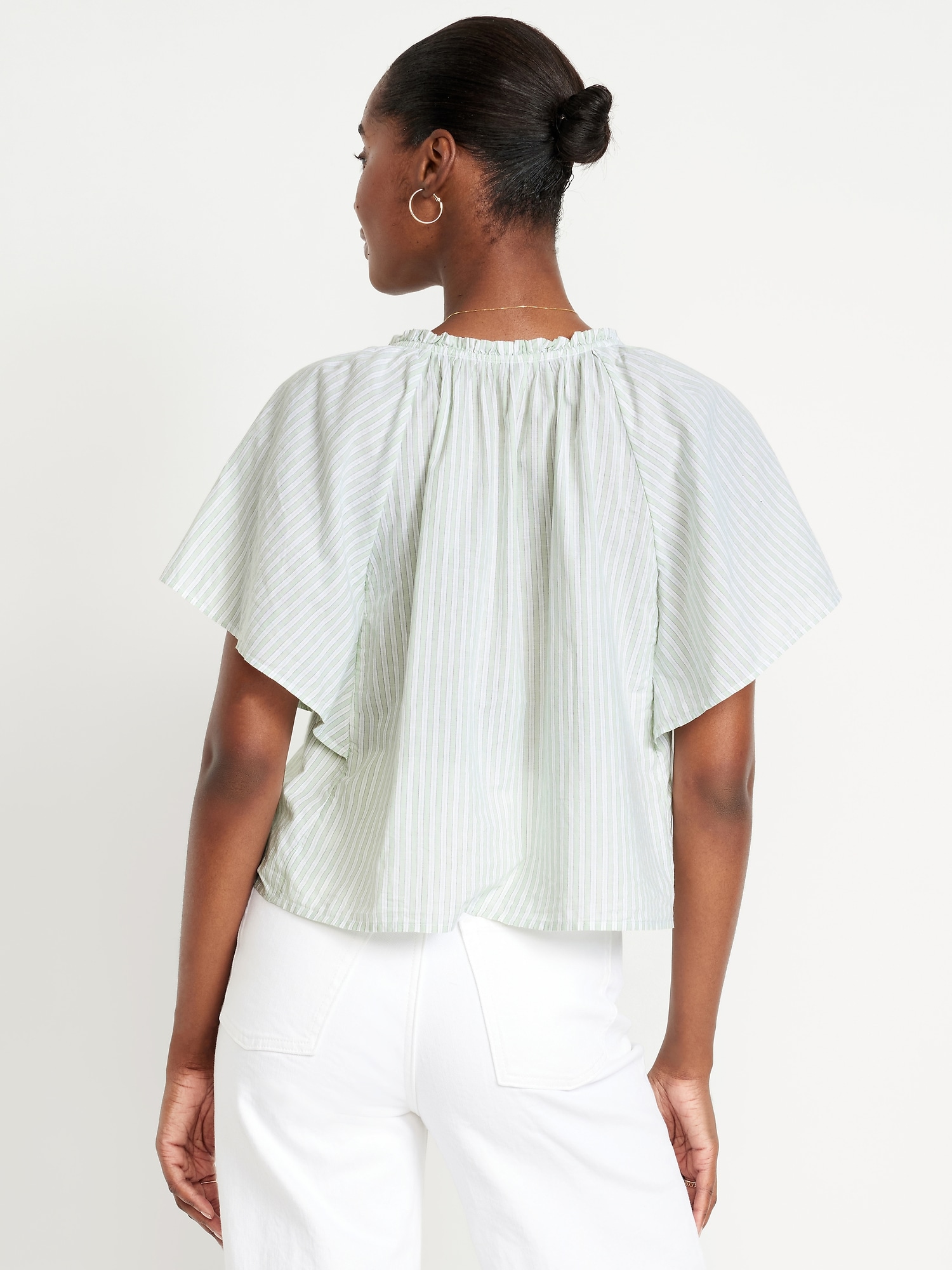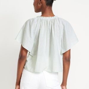 Flutter-Sleeve Tassel-Tie Top: v-neck tassel-tie front, short flutter sleeves, shirred detail, #764192