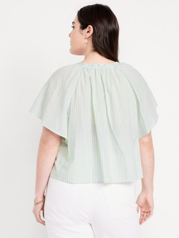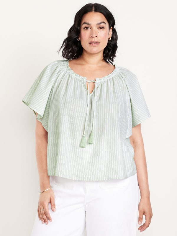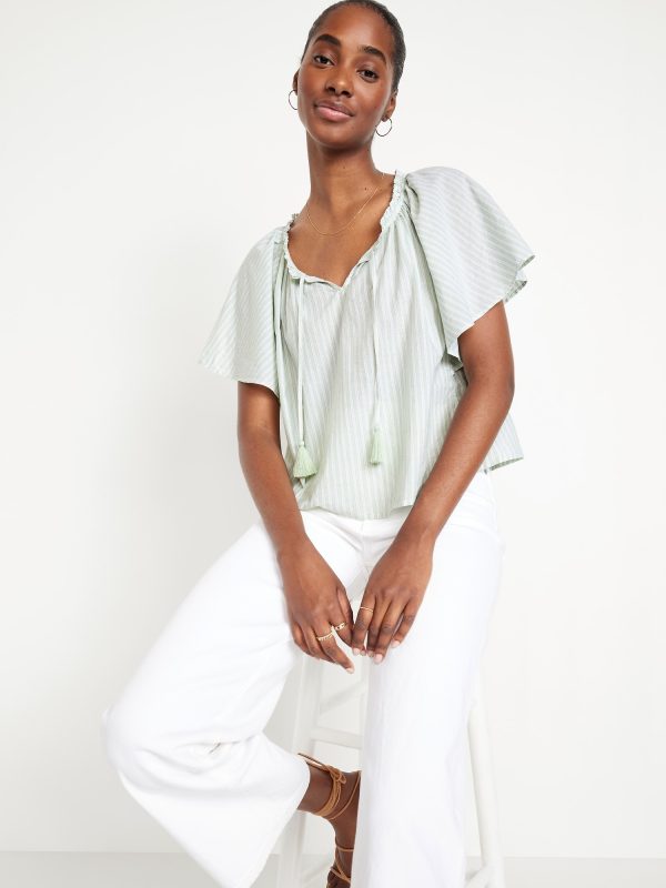 Flutter-Sleeve Tassel-Tie Top: v-neck tassel-tie front, short flutter sleeves, shirred detail, #764192