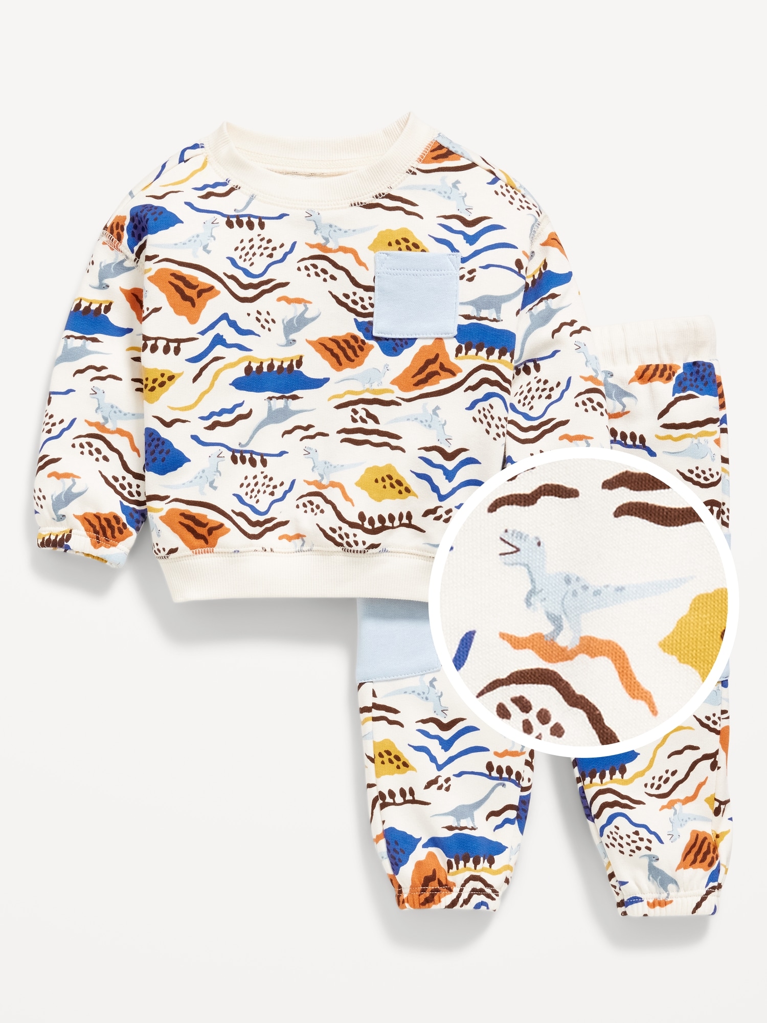 French-Terry Pocket Sweatshirt and Sweatpants Set for Baby: crew neck, long sleeves, drop shoulders, patch pocket at chest, banded hem, matching sweatpants, elasticized waistband, functional drawstring, all-over pattern, #801505