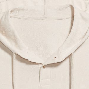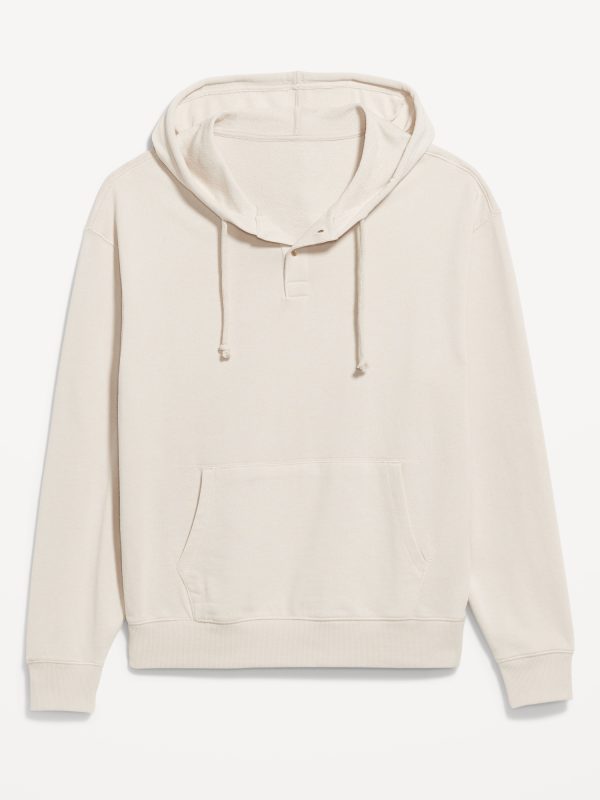 French Terry Pullover Hoodie: drawstring hood, long sleeves, henley-button placket, kangaroo pocket, rib-knit cuffs and hem, pullover style, #717405