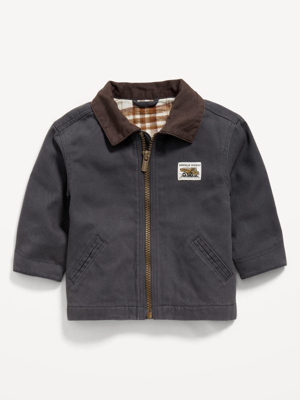 Full-Zip Twill Barn Coat for Baby: pointed collar, long sleeves, embroidered patch at chest, welt pockets, full length zipper, #801516