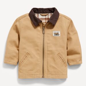 Full-Zip Twill Barn Coat for Baby: pointed collar, long sleeves, embroidered patch at chest, welt pockets, full length zipper, #801516