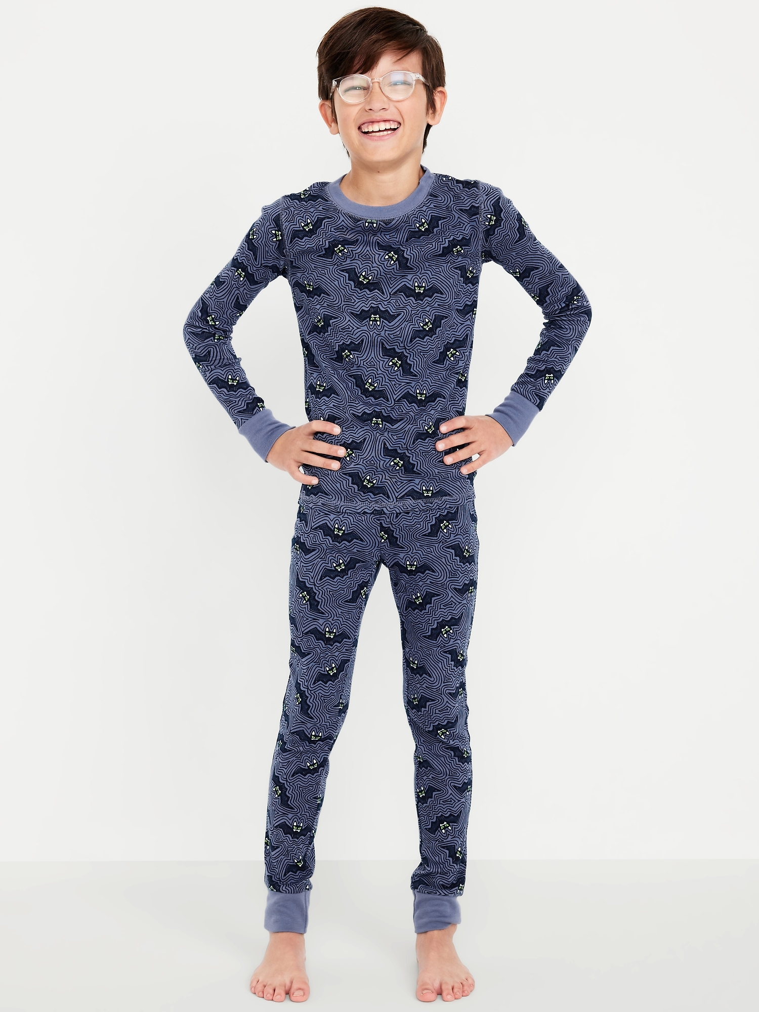 Gender-Neutral Snug-Fit Graphic Pajama Set for Kids: If you’ve got it, haunt it—in our matching jammies.crew neck, long sleeves, graphic at front, coordinating pajama pants, elasticized waistband, all-over print, #788072