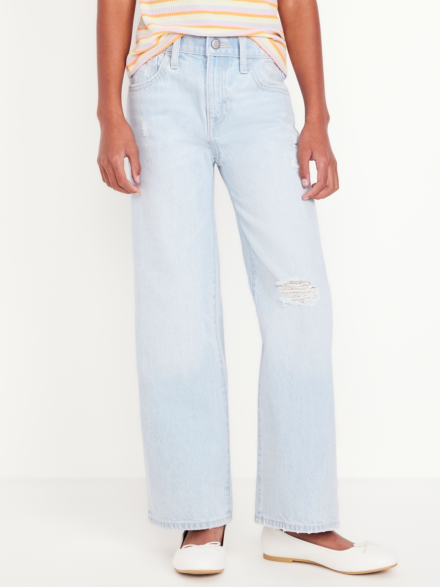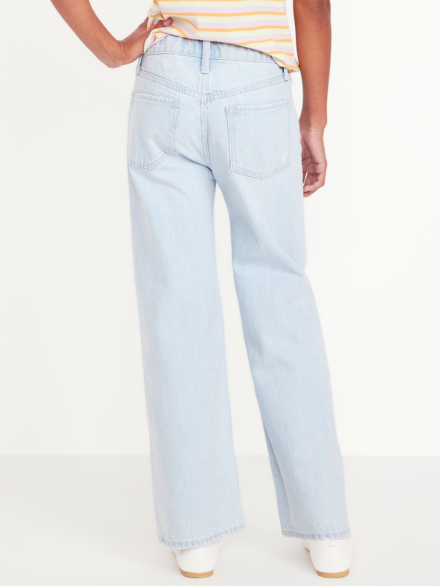 High-Waisted Baggy Wide-Leg Jeans for Girls: The it fits she really, really wants.interior adjustable waistband, snap button closure (sizes 5-8), regular button closure (sizes 10-20), zip fly, scoop pockets and coin pocket, patch pockets at back, wide leg opening, #803677