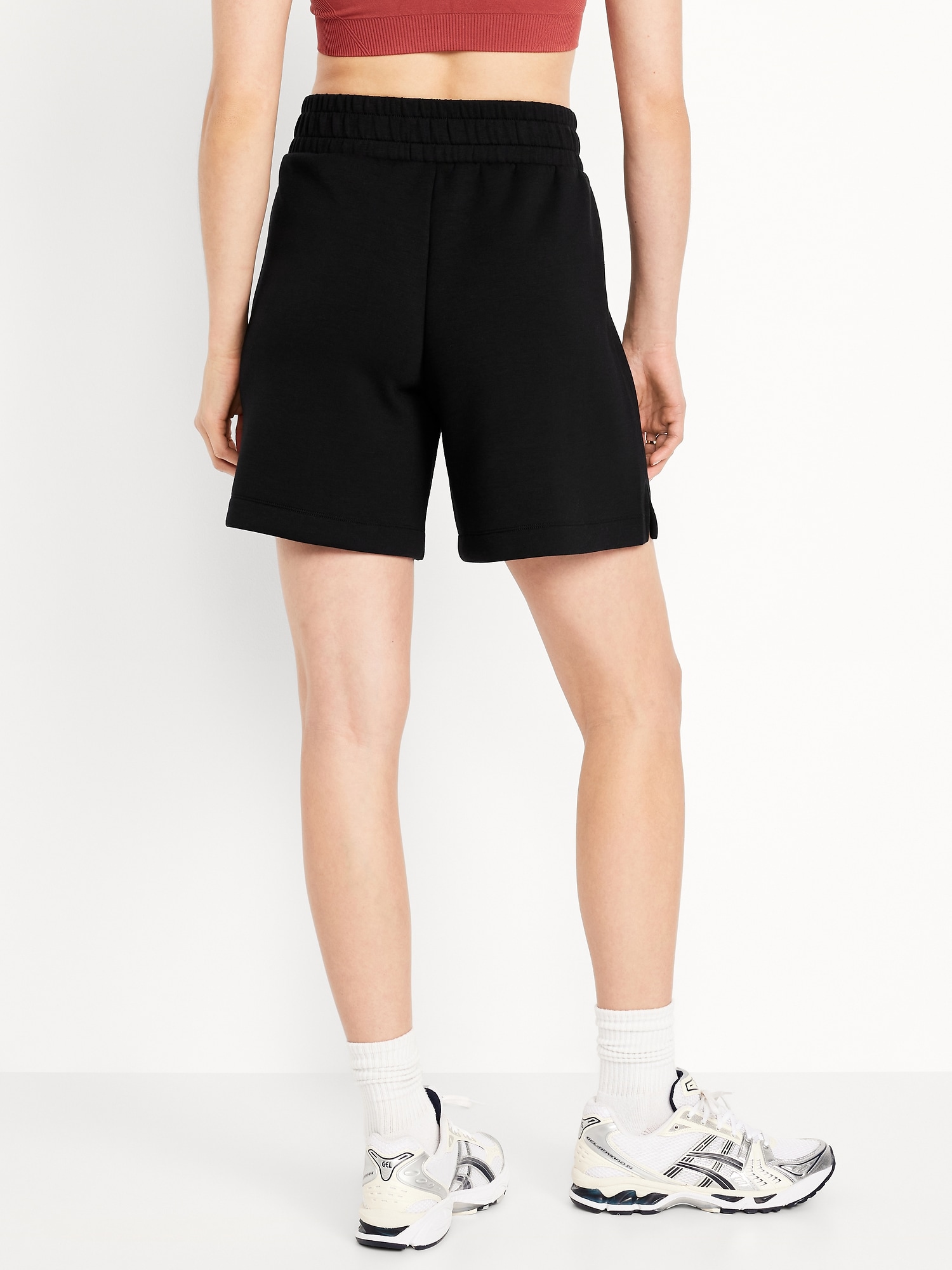 High-Waisted Bounce Fleece Shorts — 8-inch inseam: Featuring Bounce Fleece. A smooth, cooling finish that feels good and looks chic everywhere you go.elastic waistband, breathable, pull-on style, #764339