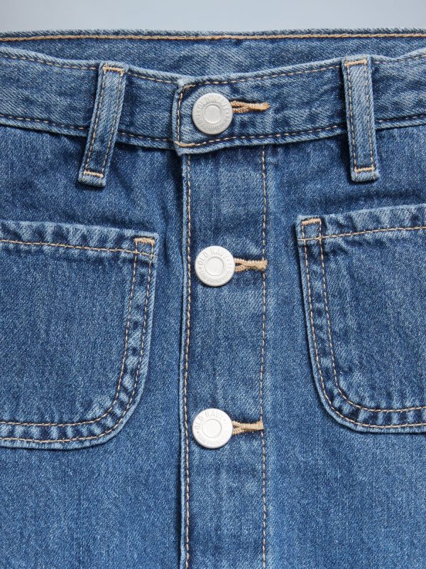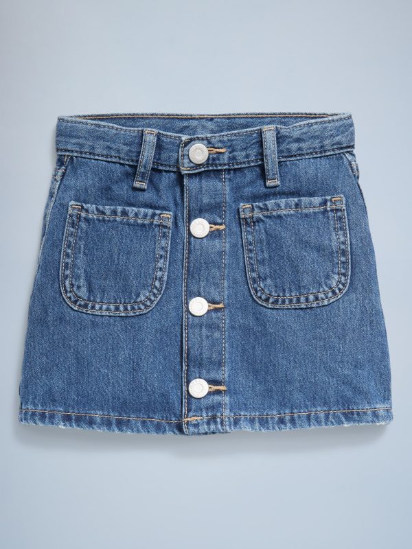 High-Waisted Button-Front Jean Skirt for Toddler Girls: interior adjustable waistband, four snap-button closure, patch pockets at front, patch pockets at back, asymmetrical center seam at front, #694489