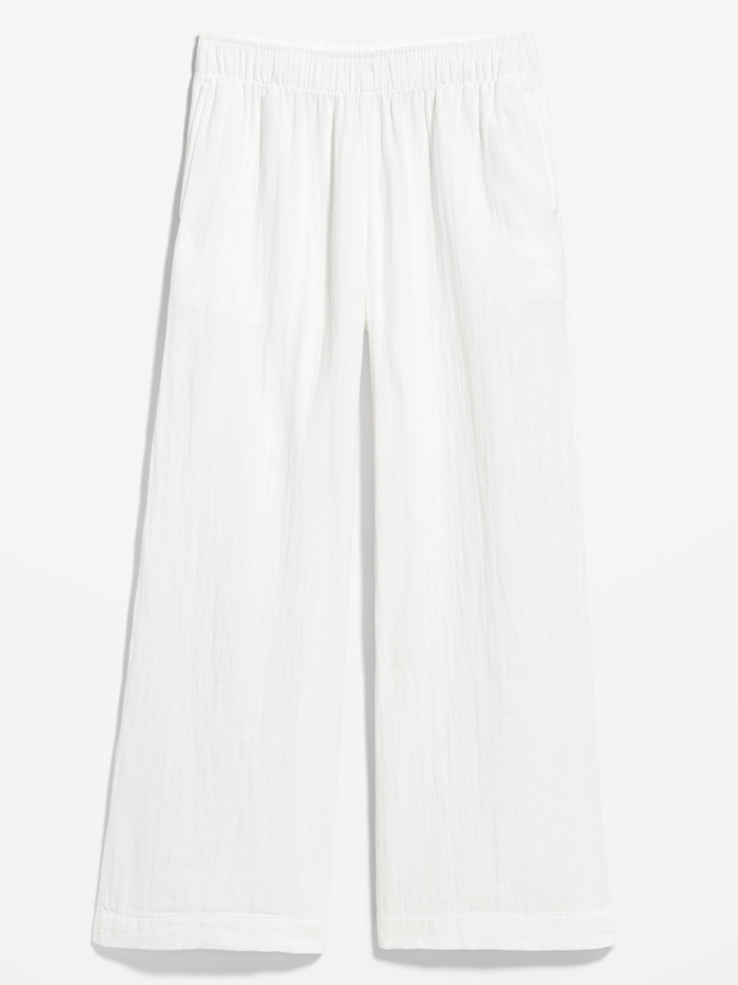 High-Waisted Crinkle Gauze Super Wide-Leg Pants: A light, rippled fabric that’s begging to be beachside.comfort-elastic high pull-on waistband, on-seam pockets, super wide leg, striped print, #683359