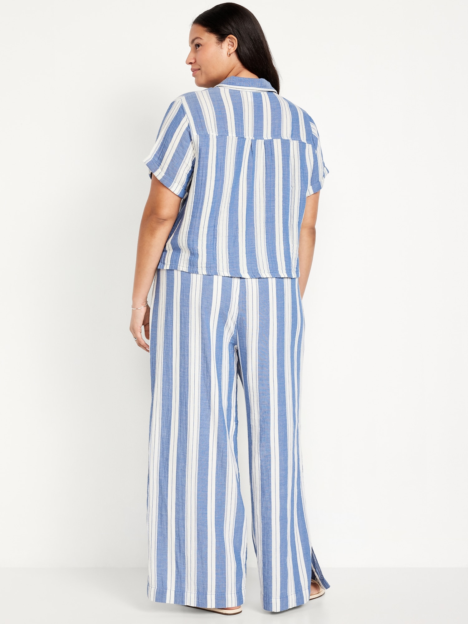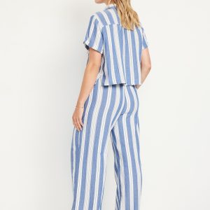 High-Waisted Crinkle Gauze Super Wide-Leg Pants: A light, rippled fabric that’s begging to be beachside.comfort-elastic high pull-on waistband, on-seam pockets, super wide leg, striped print, #683359
