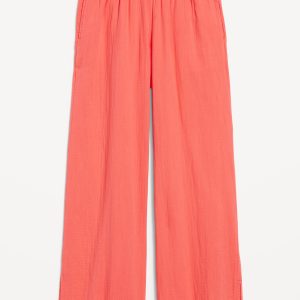 High-Waisted Crinkle Gauze Super Wide-Leg Pants: A light, rippled fabric that’s begging to be beachside.comfort-elastic high pull-on waistband, on-seam pockets, super wide leg, striped print, #683359