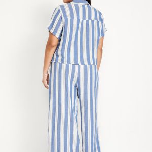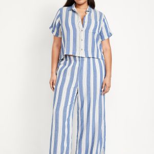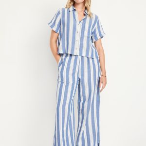 High-Waisted Crinkle Gauze Super Wide-Leg Pants: A light, rippled fabric that’s begging to be beachside.comfort-elastic high pull-on waistband, on-seam pockets, super wide leg, striped print, #683359