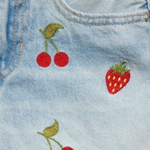 High-Waisted Embroidered Frayed-Hem Jean Shorts for Girls: interior adjustable waistband, sizes 5-8 snap-button closure, sizes 10-20 regular button closure, zip fly, scoop pockets and coin pocket in front, patch pockets in back, rips/tears at front for a lived-in look, frayed hem, #855327