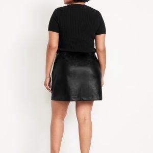 High-Waisted Faux-Leather Mini Skirt: wrap front, left side zipper, darted back, plaid print, #804477