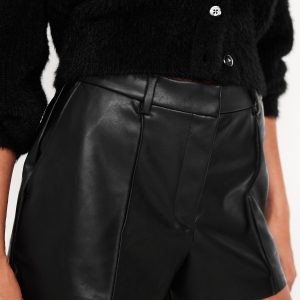 High-Waisted Faux-Leather Shorts — 3-inch inseam: high fixed waistband, belt loops, hook-and-bar closure, zip fly, diagonal hip pockets, back right welt pocket, pintuck front, #804515